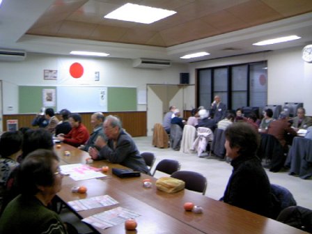 今日は華の樹会(老人会)の新年会10時から場所は何時もの水辺憩いの家朝ゴミ出しをしてから出かけました開会の言葉君が代斉唱、新年のことば、新年の歌(1月1日)何とか歌えるものですね 最近の人は歌えるのかなぁ? ゲーム 輪投げ 最長齢参加者は94歳ゲーム 豆つまみ 滑って中々つまめません ゲーム しゃもじリレーゲーム カローリング カーリングより簡単に楽しめますカローリングの玉 3輪で動きます 昼はお寿司が出ましたが撮るのを忘れましたどうも食べ物は箸が先に動いてしまいます 午後はビンゴ大会カメラ持って行くのを忘れたので携帯で撮りました・・・2時近くまで楽しませて頂きましたビンゴ大会の結果は・・・明日に残しておきます