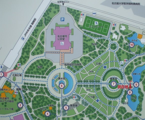 今日の薔薇は18日に行った鶴舞(つるま)公園です。公園の案内図から 左端の正面広場の左側が鶴舞(つるまい)駅です駅から噴水塔の右を廻りバラ園を見て奏楽堂の先まで行き、名古屋市公会堂側を戻りました 正面広場から噴水塔を 噴水塔を右に廻り バックは名古屋市公会堂ですバラ園が見えてきました此処のバラは列毎に同一品種が植えられています バラ園の左側に乙女の像がありましたバラ園は更に続いています大都市の中の公園なので大勢の人出がありました此処で11時半頃でしたこれは奏楽堂 真ん中の舞台は木造で侵入禁止でした奏楽堂の上から観客席とその奥にバラ園が見えますこちら側にも彫刻が石竹の花壇の奥にバラ園が見えます お弁当広げている人たちも名古屋市公会堂の正面です 此処からは品種のアップオレンジバニーシルエットニコルピムリコマチルダ月光 平日の晴れた昼間でしたので見物客は多かったですね。株の間が詰まって密生されているので、見た目は華やかで豪華でした。見物客もお弁当持って来ている人が多く木陰で食事をしながら楽しんでいました。市内にある公園は交通の便も良く、手入れもされてきれいでしたね。