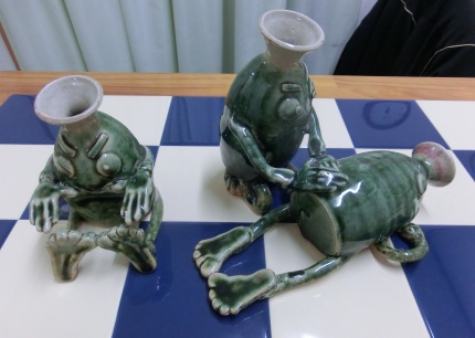 今日は天気が良いが囲碁クラブの日。8:45に家を出て憩いの家に。 参加者は15名。女性は4名。午前中遊んで来ました。来週は第五木曜日で休みだったのですが皆さん出てくると言うので開催することになりました。帰りは真っ直ぐVitzに障害者支援券でガソリン補給。向かいに新しくできたセブンイレブンに入ったこと無かったので様子見で買い物。家に戻って昼食。はづき治療院に電話したら6時からしか空いて居ないとのことでしたが予約。時間が有るので碁会所に行くことに・・の前に名古屋銀行に寄って生活費を下ろしてから・・明日透析で土曜日は出かけるので少し早めに下ろしてきました。碁会所ではリーグ戦の終わった人ばかり。しょうがないのでオープン戦で時間潰し。5時半にマッサージに向かいました。この写真分かりますか?はづき治療院に置かれています大きさが分かるようにリモコンの横で・・マッサージしています反対側から写真を撮っていたらもう一つ並べてくれましたこちらは前屈運動反対側からとっくりとっくんと言います・・ユルキャラでは有りません。土岐市下石(おろし)町の町興しで作られています。詳しいことはとっくりとっくんHPで見てください。
