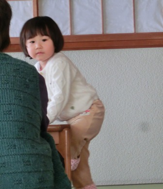 今日は3人とも8時過ぎまで朝寝。こういうときは私が最初に起きます。何をするわけでも有りませんが・・女房は朝食の後お掃除・・私は洗濯物干し。今日は息子の嫁さんが姫孫を連れて遊びに来るとの事。珍しく電車で来るらしい。やってきたのは昼過ぎ・・五人でお鍋を囲んで・・姫孫は私の顔を見るとかぁしゃんに抱きついて離れず顔も見せない。食事もしないので私は早めに食べ終わり・・食べたのかなぁ・・居間と和室のふすまを取り払い女房が息子、嫁さんと4人で遊んでいるとき一枚だけ撮りましたカメラを向けたり私の顔を見ると隠れてしまうので女房の背中越しに一枚だけ撮りました。帰る頃には私の顔を見るようになりましたがカメラを向けると隠れてしまうので結局一枚だけだった。4月には3歳になりますがなぜか私が苦手のようです・・女房には1時間くらいで馴染みます。5時前に息子が車で送っていきました。次回には大丈夫かなぁ・・