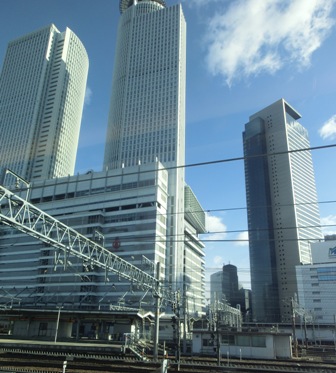 名古屋を予定通り9時過ぎに出発。 雪の影響は無かったようで晴れています。 新幹線の中からスパイラルタワーを撮りました。