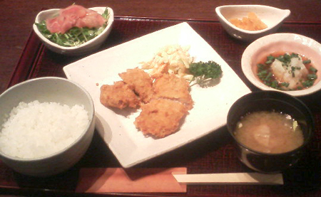 今日はカツが食べたかったので、ちょっと遠出してみました。【本日のお店】豚肉創作料理やまと 二丁目本店 http://www.frieden-dining.com/ 東京都中央区銀座2-6-1 中央銀座ビルB1F カツ丼900円、ロースカツ定食(?)1100円、とか悩んだのですが、週代わりのレディースランチ 1000円にしました。やまと豚のヒレカツおろしポン酢添え、ご飯、お椀、サラダ、香の物やまと豚のヒレカツはさくさくで、やわらかくて、臭みも油もなくて、ホントおいしいおろしポン酢がさっぱりしてて、またまたおいしい一気に食べちゃってから気が付いたのですが、そういやとんかつにソースが大好きなんです。。一切れくらいはソースで召せればよかった。。全部食べちゃってから気が付きました。。サラダってトマトが乗ってるんだと思っていたら・・・生ハムじゃないですかこの生ハムがこれまたおいしいーデザートはみかんのゼリーに角切りフルーツが乗ってましたランチのデザートって、しあわせ~コーヒーまで!!レディースランチじゃなかったら、デザートは付いてないし、コーヒーは+200円になります。レディースセットってかなりお得だわ~遠出したかいがありましたー大大大満足~ごちそうさまー