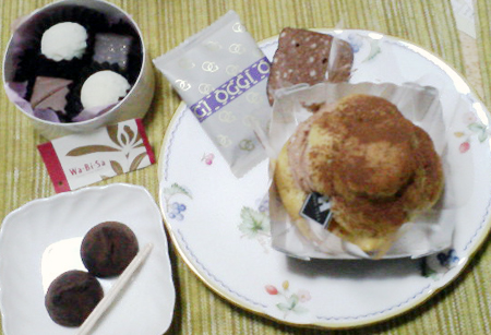 だんなさんへのバレンタインはとても楽しみ何て言ったって、一緒に食べれるんだもんねーいつもは贅沢で買えないチョコレートだって、この日ばかりはあなたの為よってな大義名分があるのだー-バレンタイン進呈の儀-OGGiのチョコレートクッキー 10枚 525円http://www.cucina-oggi.com/会社の人にコレを配ったら、「これ美味しいっすねー」と何人も言ってくれてちょっとうれしかった。選んだの華ちゃんだけど。あんまり「美味しい」とか言ってくれたので、つい食べたくなってお買い上げ。義理チョコってさ、毎年買うけど、自分は食べれないんだもん・・ マカデミアナッツを加え香辛料を利かせた生地は、甘さを控えた大人の味。 ビターチョコレートでコーティングしました。 サックリとしたフィーリングが自慢のエレガントなクッキーです。だってさ。コレ、ホントに美味しいわ。華ちゃん、ナイスチョイスですよ。見た目のイメージはラングドシャーだったんだけど、もっとしっかりと深みのある味。かなりシナモンきいてます。だんなさん、シナモン苦手なはずだけど、「このシナモンは食べれる」て食べてました。きっとビターチョコレートとのバランスがよかったのでしょう~Wa・Bi・Saの和衣(わころも)4つ入り840円。http://www.wa-bi-sa.com/茶包みを試食で配ってた。甘くてちょっと苦い抹茶ガナッシュをモチっとしたぎゅうひで包んであるんだけど、冷えててとても美味しいー。茶包を買ってもよかったんだけど、それは美味しい事がわかったから、横にあった、和衣(わころも)4つ入り840円をお買い上げ。それぞれ割ってみた。白いのだけ食べてみた。あま~~~~~~~~~~~~~~~~~~~~~~いホワイトチョコと、抹茶ですな。ちょっと甘すぎる気もするけど、バレンタインだしコレくらい甘いも悪くないねぇ~。後の2つは明日のお楽しみヒロタ スクロール・ミルクチョコ240円(定価300円)http://www.the-hirota.co.jp/product/fair.html地元の駅でシュークリームのヒロタがセール。気が付いたら買ってました。。思ってた以上に、美味かったです。。最下層はカスタードクリームで、その上にカステラ生地、ミルクチョコクリーム、にシュー皮がのっかって、ココアパウダー。ミルクチョコクリームが、とろとろで落っこちそうで・・ほろ苦くて、甘さ控えめ。おおお!!!ちくしょーマジでおいしいぞー!!ヒロタのシュークリームって4つで270円でしょ?!バレンタインだからって1つ240円って、ちょっとどうなの??って思ったけど、買ってよかった。お皿の上のトリフ(?)はだんなさんが職場でもらった義理チョコ。あいこさんが買った訳じゃないから省略。これにて2007年だんなさんへのバレンタイン進呈の儀、終了なり~それにしても、最近のバレンタインは高いわねぇ。。昔はGODIVAでも高いと思ってたのに、お手ごろなのかと思ってしまう。。あいこさんは庶民の舌なので、ピーナツのペーストとか、キャラメルソースとか・・ある金額を超えた外国の高すぎるチョコは、くどくて美味しいと思えないのだなぁ。。なので、今年は頑張って高いチョコを買うのは止めて、お手ごろで楽しむ方向に変えてみました。番外のABCクッキングイベントで作ったロールケーキこれもバレンタインとしてあげて、一緒に食べました。ABCクッキングの体験はとても楽しかったし、ケーキも美味しかった。
