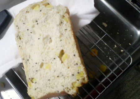 パン教室だけでは飽き足らず、買っちゃいました、ホームベーカリー、エムケーのHB-100さっそくさっそく!!上田まり子様のホームページのレシピから、大学いも食パンを作ってみましたーhttp://mari2.net/mt_recip/archives/000136.htmlおいもさんをたくさーーーーん、入れたい!!大きめのおいもさんを入れたてホクホクさせたーーーーい!!初心者なのに、勝手にアレンジ。レシピのさつまいも70gに対して100g弱。『さつまいもは、8ミリ角にし』を10ミリ角で。仕事から帰ってきてからセットしたので夜中の1時過ぎに焼きあがりましたーわーい、わーい、真夜中だけど試食試食!!さっそくケースからパンを取り出して・・・おいもさんがコロコロと・・おいもさんがちゃんと混ざってません。。羽の周りに集まってしまったたのか・・生地にうまく入り込まなかったのか、底にたまってたのか・・う"ーーーん。。あんなにいっぱいおいもさんを入れたのに。。あんまり意味がなかった・・あと、水分が多すぎたのかかな??パンの側面が凹んでしまいました。やっぱりレシピのとおり、いもの大きさや量は守った方が良さそうですね。ほかほかパンを少し食べて、ふきんをかぶせて寝ちゃいました。もちろん今日の朝食は大学いも食パンですよ。朝のほうが美味しかった!!おいもさんとパンがしっとりとなじんで、生地ももっちりして・・夜食べた時はおいもさんの甘味があんまり感じられなくてがっかりした(鳴門金時を奮発したのに・・)のだけど、朝はちゃんとホクホクと甘味があるのでした~パンは焼きたてが美味しい!って思ってたけどそうばっかりでもないのね。きっと、パンを上手に焼く方からすれば『失敗』なんだろうけど、自分としては美味しくて大満足ですー次回はおいもさんを混ぜるところは手動でやってみたいです★食パンコースの焼き色「ふつう」で焼いたのですが、けっこう薄めの色でした。次回からは濃いめで焼いてもいいかもー次は何パンを作ろうかしら