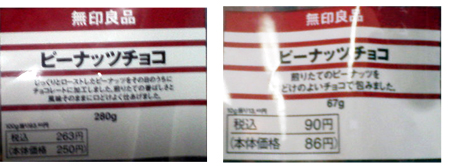 無印良品のピーナツチョコが大好物です。 帰宅途中にあるファミマでよく買います。 土日に1袋空けちゃったりしちゃいます。 いろんなメーカーがいろいろ出てますが、あいこさんは無印良品のピーナツチョコが一番美味しい!好き! こないだ無印良品に行ったらば、ピーナツチョコが期間限定で30円ほど安くなってた!ピーチョコはすぐに無くなっちゃうのだー、これは買わねば! おうちに帰って、びっくり!! ファミマで買う方が安いじゃん。。 ファミマ 280g 250円くらい 無印良品 200g 200円くらい(値引き後) 何でだよ?! 同じ「ピーナツチョコ」なのに 無印良品の商品を無印良品で買った方が高いの??しかも値引きしてるのに?? なんか・・なんか納得出来ない感じ・・・ まあ、いいや~流通上でなんか一般人にはわからない事情があるのかもしれん。気分を直して・・せっかく買ったピーチョコ、美味しく食べよーっと。いっただっきまーすなんじゃこりゃぁああああ!!!毎日ピーチョコを食べてるあいこさんの舌をなめんじゃねーぞ!!味が違うじゃねーか!!ファミマのピーチョコは食べた最後の方に、きな粉を食べてるような香ばしさが残るのだー他の会社のピーチョコにはその余韻の香ばしさがないから、無印のピーチョコが一番好きなの。なのに・・なのに・・なのに・・無印で買ったピーチョコにはその香ばしさが漂ってこない・・・じーっくりパッケージを眺めると、ファミマ じっくりローストしたピーナツを・・・ 無印良品 炒りたてのピーナツを・・ ↑この違いのようでした。※写真は日記載せる為に後日買ったものなので、値段が上と違ってます。無印のピーチョコ、ファミマで売ってるのと無印で売ってるのは別物なのね、知らなかった。。ちなみに製造工場は一緒でした。 というわけで、あいこさんの独断の主観で一方的に結論を出してみました。----------------------------------------------------------------------------- 無印良品のピーナツチョコは無印良品で買うよりファミマで買った方が圧倒的に美味い!安い! -----------------------------------------------------------------------------味の好みはそれぞれなので、無印で買ったピーチョコのほうが好きって人がいて当然だと思いますが、商品名が同じだし、パッケージも似てるしさー。。一緒の商品と思っちゃったじゃん・・なんとなく、すっきり納得出来ない結果なのでした。。 改めて並べてみると、形も違います。左がファミマ。右が無印。あいこさんがいつもお世話になってるファミマのピーチョコ。、