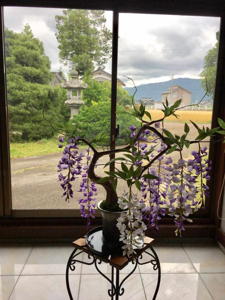 庭のセンダイハギと、私お手製、創作盆栽の藤がいい感じでしょ?