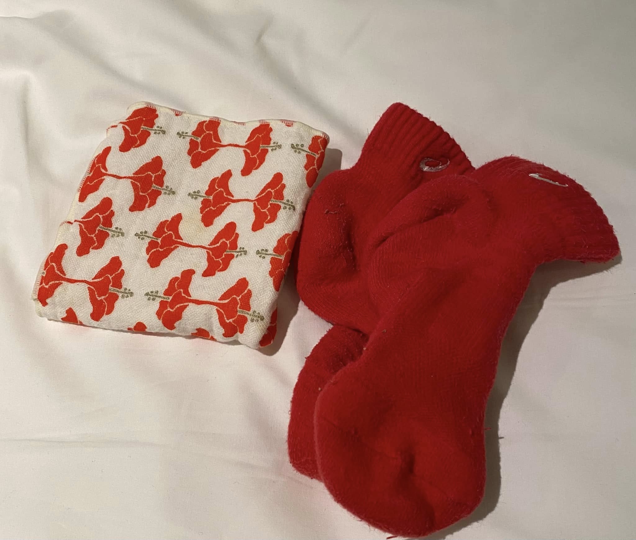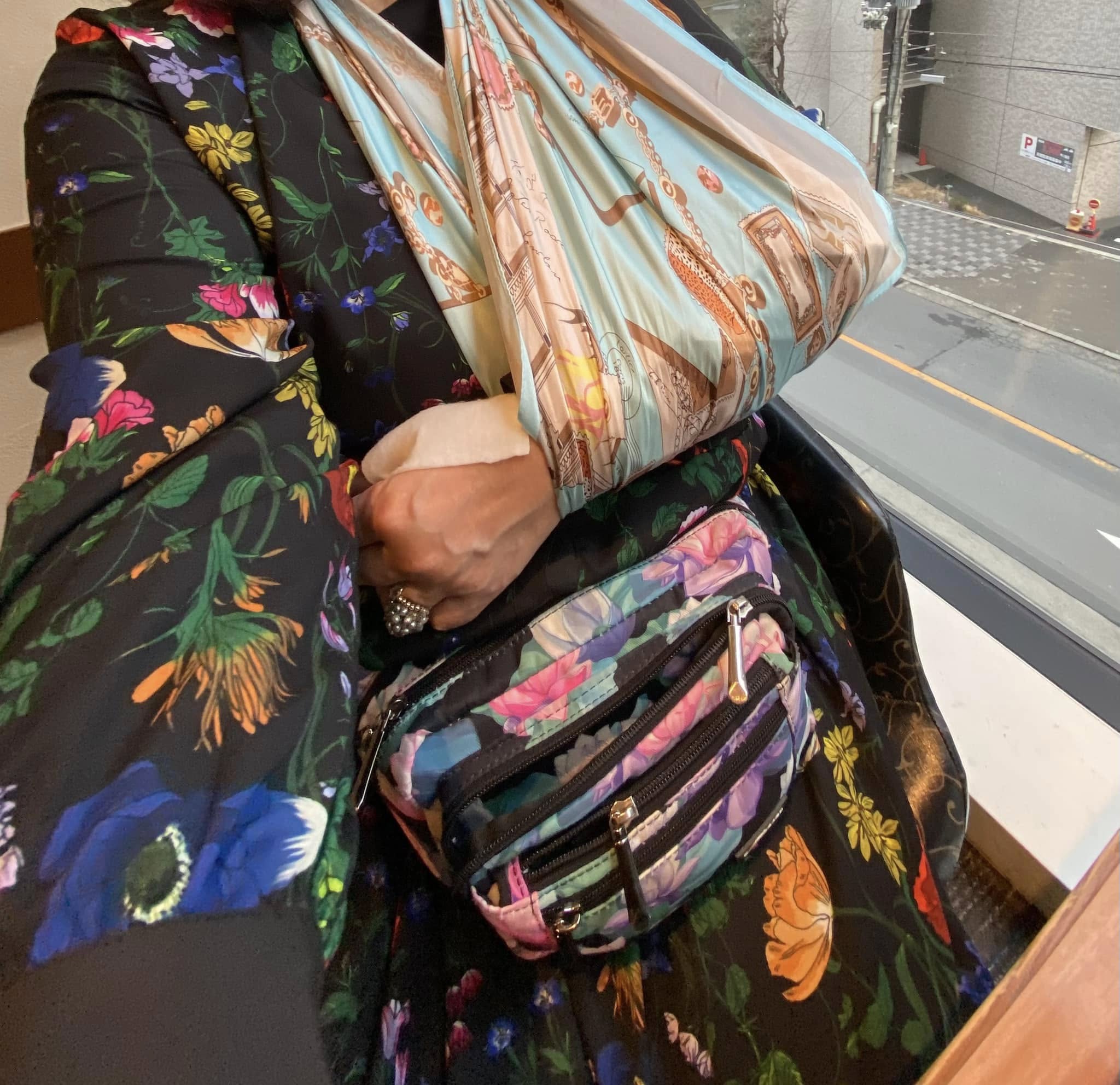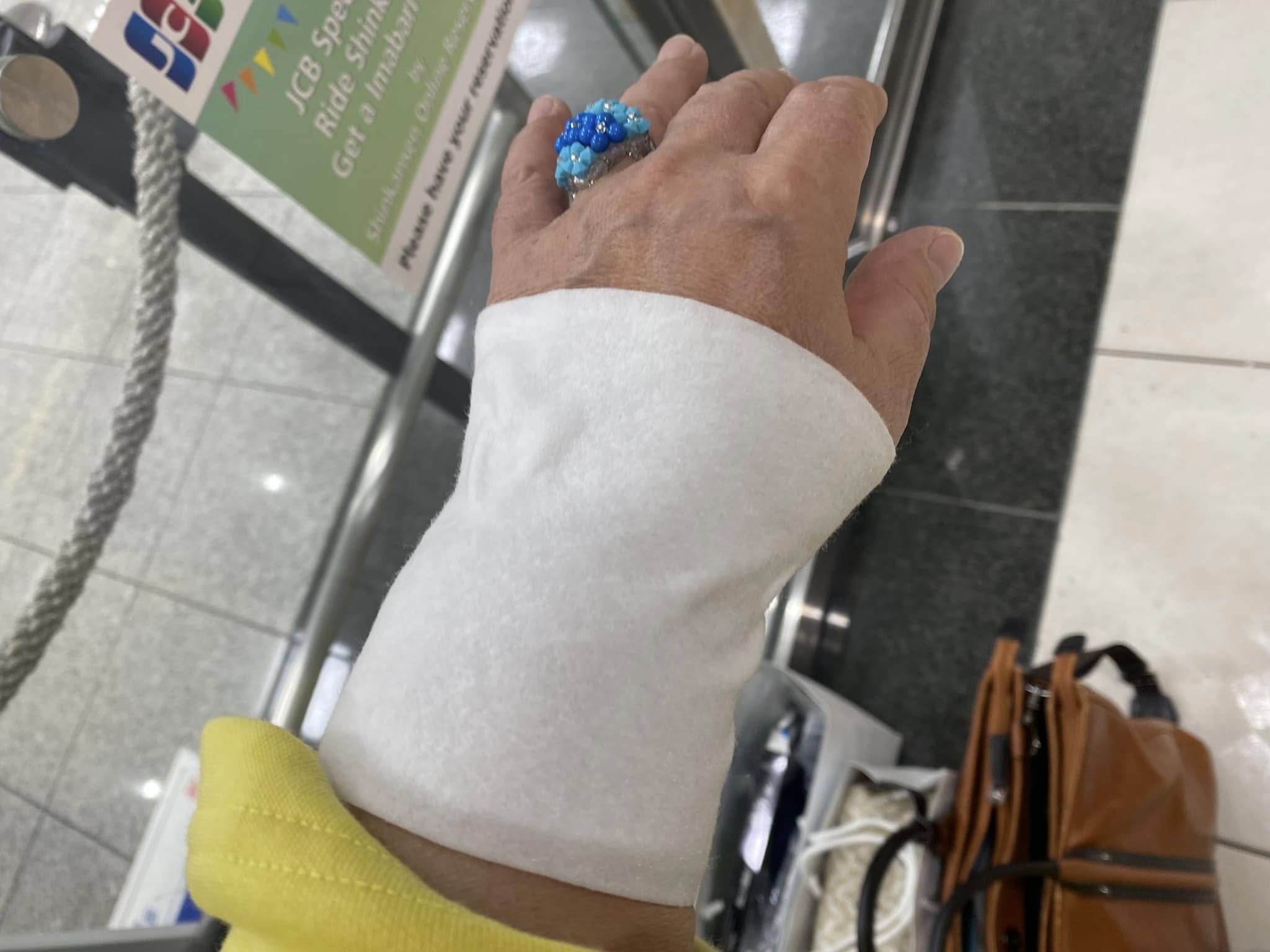 たまたま持ってきた、スカーフで、三角巾を創った。