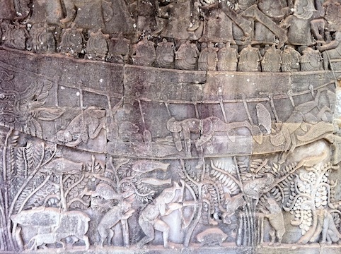 バイヨンのレリーフ見学は続きます・・・。レリーフを見ていると、欧米系の妙齢女性一人旅を案内する一人のカンボジア人ガイドさんに目が止まりました。背が高くって、肩幅があって、顔もカッコイイ(男らしさと少年ぽさが絶妙にミックスされている系)・・・。「あそこにいるガイドさん、イケメンじゃない?」と友人Iにささやく私。「いいな~、あの人(お客の欧米系妙齢女性)・・・」 と彼のお客さんを羨望のまなざしで見つめる私。私がイケメンガイドをチラ、チラっと見ていると、彼もこちらを気にしてチラ、チラっと恥ずかしそうに(!)見ています。ふっふ、なにしろこの国では美人とされている私、「あれ行ってたら、行けたぜ?」ってことになーるーかーもー!!!ところが、「あの人は別にイケメンではありません」とガイドのP青年が衝撃の発言。「ええっ?あんなにカッコイイのに?」とビックリする私達。「背は高いかもしれないですが、イケメンではありません(断言)」・・・なんか、やっぱりカンボジア人と日本人の美的感覚はズレているような気がしたのでした・・・。 レリーフは、世界観が何分割かに分かれています。船の下に畑があるけど、船と畑は別の世界ってことで見る感じらしい。船はトンレサップ湖に浮かぶ船で、人と魚が泳いでます。人と魚の配置の仕方がなんか涼しげで可愛いのだ。 今夜は焼き魚だ!古代の料理だけど、普通に美味しそうだな・・・。 アンタの稼ぎが悪いせいで!・・・と鬼嫁に怒られるサラリーマン的な?レリーフ。 このレリーフは凱旋宴会の準備中だそうです。 ノリノリのアプサラちゃん。 ここからは四面仏です。 「やあ、いらっしゃい」と言われているような・・・気も! 慈しみ深いお顔がたまりません。 仏様にキスしてみる筆者。 鼻と鼻を合わせるエスキモーのキッス。 続く