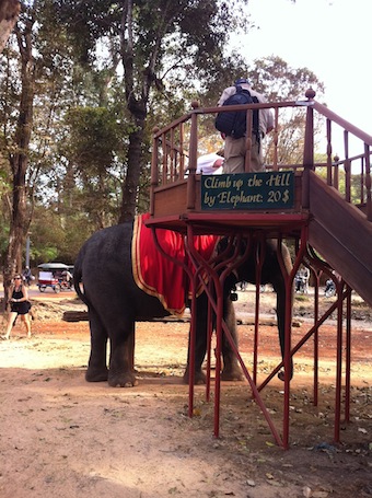 アンコールワット内部を堪能した後は、プノンバケンで夕日です。ここは夕日のベストスポットということで、少し慌ただしく移動。17:30に入場が打ち切られてしまうのだそう(17:30前に300人以上入場していた場合は、もっと早く打ち切られてしまうのだとか。以外と制約が多い遺跡なのね・・・)。小高い山の上にある遺跡なので、ゾウさんに乗って登ります。やった、やった!ゾウさんに登って詣でるって言うとインドはジャイプールのアンベール城を思い出す(こちらの日記を)。ゾウさんを待っている間、ボーっと周りの風景を眺めてると、小さな女の子二人組が、はしゃぎながら「アイリメンバーユーッ!!」と絶叫している。「んん?どうした」と女の子たちの視線の先を見てみると、はにかんだ笑顔の欧米系のメンズ二人組が(そこそこイケメン)。「あの子たちは、『私のことを覚えていておいてね』って言いたいんですよ。将来、私をお嫁さんにして外国に連れて行って欲しいと言ってるんだと思います。可愛いなあ・・・」とガイドのP青年。ふーん、なるほどなあ・・・と微笑ましく見ていると、「でもあのメンズ二人組、カップルだよ」と友人I。本当だ!なんか雰囲気が違うと思ったらカップルか~。カンボジアには旅行中のゲイカップルが結構多いのだ。そうこうしているうちに、私達のゾウさんが到着。ゾウさんライドは実に3年振り・・・。台の上からゾウさんに設置されたベンチのような椅子に移ります。 ゾウさんライドは20ドル/一人なのだ。高い・・・。 ピーピピピー♪と葉っぱの笛でゾウを操る?ゾウ使いの兄さん。チップは背中にね! 下りのゾウとすれ違うときが、なにげに怖い!道幅が結構狭くて、下は崖になっている・・・。転げてゾウの下敷きになったらもうお陀仏だよ! ゾウに乗りながら携帯、古代と現代が交差する風景。「もしもし、俺。あと一本で終わるからさー(彼女に連絡設定)」アテレコby友人I。 プノンバケン到着。 観光客の皆さんも、どことなくお疲れ気味だ。 シヴァリンガ発見!♪会いたかった~会いたかった~会いたかった~イエイ!♪ ローカルの高校生たちがキャッキャしてて、すごく楽しそうだった。いいねえ・・・リア充だねえ・・・。 何人かでお散歩(?)に来ていた少年僧を激写。 今までずっと無言だったゾウ使いの兄さんが、頂上に着いたときに「アンコールワット」とボソっとつぶやきました。見ると、遠くの方に小さ~いアンコールワットが見えました。寡黙なゾウ使い・・・なんかカッコイイな。プノンバケンに登ったはいいものの、既にくもり空が広がっていたので、夕日は見られませんでした・・・。朝日に引き続き残念・・・。かなりクタクタになっていたのにもかかわらず、車の中でカラオケ大会開始。「お二人は歌好きですか?私はいつもよく歌ってますよ~」とガイドのP青年。カンボジアの歌をリクエストしたところ、なにやら哀愁たっぷりの演歌風バラードを熱唱(誕生日に彼女に振られてしまったという失恋バラードらしい)。お返しにKARA(♪今すぐにミスタ♪サビだけ・・・)を歌う私達なのだった。K-POPはカンボジアでも人気らしい。これにて、本日の行程は終了~。 朝日と夕日は見えなかったけど、満足っちゃ満足しました(笑)。続く