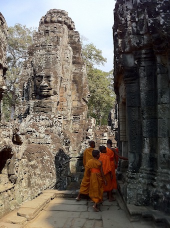 バイヨンの四面仏を見ていると、少年僧たちがたくさんやって来ました。 石の中にオレンジの鮮やかな袈裟が映える! まだ7~8歳くらいかな? 可愛いな~。 絵になるな~。 修行がんばってね! 後ろの子にガン飛ばされちゃった! 彼らを一生懸命撮っていたら、「aitanキモイ・・・」と軽く友人Iに引かれてしまいました(そんな趣味はありませんよ!)。ガイドのP青年が「彼らと一緒に撮ってあげましょうか?」と言ってくれたけど、邪魔するのも悪いと思って遠慮してしまった。やっぱり素直に撮ってもらえばよかったかな・・・てへ。続く