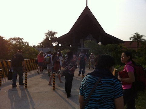 だんだんと高度を下げていく飛行機の窓から見えるのは、ひたすらに広がる茶色い平原・・・(角度によってはアンコールワットも見えたかもしれない)。「茶色いね・・・」「うん・・・」と言葉少ない私たち。ついにやって来たカンボジア。気温が・・・暑い!地図上ではクアラルンプールから北上してきたことになるし、まだ早朝なんだけど、「むーん」とした暑さを感じる。でも「もわ~」っとした東京都心の真夏とはちょっと違う暑さ。コンクリートジャングルの暑さは半端ないということだろう。飛行機を降りてみて気が付いたのだけど、殆どの旅客が20代か30代の若い人達で占められている。しかも欧米系バックパッカー風のヤングが多い。今は欧米も春休みなのだろうか・・・ちなみに私達の前の席に座っていたのはメキシコ人カップルだった。 飛行機から降りるヤング達 ホテルのような美しい空港 飛行機を降りて、伝統家屋を模して作られた平屋建ての建物に入る。意外と綺麗。「意外と」と言うか・・・想像していたよりも、とっても綺麗な空港なのだ。規模は小さい空港なんだけど、建物も比較的新しいし、お掃除も行き届いている。ここから緊張のビザ手続きである。昨日KLのモールにある写真屋さんで撮ったIDフォトと、パスポートと、機内でもらった書類等を提出(IDフォトはシェムリアップの空港でも撮れるらしい、という情報があったけど実際にその場で撮影出来るかどうかはよくわからなかった)。イミグレのお役人に「袖の下」を渡さないとビザ出してもらえなかったり、時間が死ぬほどかかったりするんだろうか・・・とビビっていたが、イミグレ窓口は日本の古い市役所のそれよりずっと綺麗で、ビザ発行作業も実にテキパキとシステマティックに処理されているように見えた。職員の人に「aitan~」と名前を呼ばれたら、窓口に行ってビザのシールが貼ってあるパスポートをもらう。これで終了。ビザ発行にかかった時間は約数分だった。勝手に色々と憶測し、ビビっていた自分が恥ずかしくなる。シェムリアップはさすが世界的な観光地、ちゃんとしているんだなあ・・・。 ターンテーブルにて。この奥がイミグレになっている。 スーツケースを受け取り(勝手に荷物を持っていくボッタクリポーターも皆無)、空港出口にあるタクシーチケットの窓口でホテルまでのタクシーを頼む(お値段は7ドル)。空港を出るなり、ローカルのタクシーやトゥクの客引きにウワーッ!と囲まれて、客取り合いの小競り合いに巻き込まれてしまうかと思っていたけど、それもなし(映画「オーストラリア」で、ニコール・キッドマンが巻き込まれてしまうみたいなのを想像していたw)。タクシーのドライバーさんは「明日の予定は?どこを回るの?」と一応チャーターの営業はするが、「ガイド頼んであるから」と言うと、あっさり引き下がる。飛行機から見えた通り舗装されている道路以外の地面は赤茶色で、どこまでも平原が続いているように見える。空港の周りには背の高いビルが一切ないから、開放感がある。車窓からバイクや自転車に乗ったローカルの人々が行き交うのが見える。荷台にタイヤや野菜を溢れんばかりに積んだリヤカーや、しつこい物売り、下世話な好奇心に満ちた男たちの視線・・・というベタでギラギラした東南アジアの定型印象はまるでない。ローカルの人が自転車に乗っている姿には、朝だと言うのに何とも言えない余裕のようなものも感じられて、優雅にさえ見える。とにかく、のどかなのだ。 赤茶けた平地が広がる。 朝の風景。 通学中の小学生たち。 道路の周りには団体用に使われそうな大きなホテルが、クメール語と英語で書かれた看板がゴチャゴチャしない程度に並んでいる。10数分でホテルに到着しました。続く