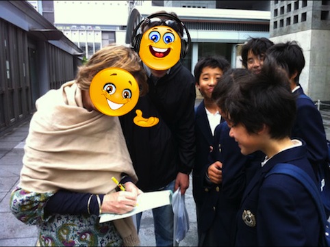 宇治からJR線で京都駅に戻り、バスに乗って清水寺へ向かいます。京都駅のバス乗り場をウロウロしていたら・・・「エックスキューズミー!」と私達に話しかける声が。振り返ると修学旅行中の中学生グループが立っていました。「ウィーアー、◯◯ジュニアハイスクールスチューデント」「ホエアアーユーフロム?」プリントを見ながら必死に夫ジェローム(仮名)と義母マミンカに話しかけて来る中学生たち。どうやら、学校の課題のようです。 「ふふ、夫日本語ペラペラなんだけどな~」と思いつつ、中学生たちに英語で対応する夫を見つめる私。「ホエア アーユー フロム?」「I'm from Czech Republic」チェコどこかわかるかな・・・と見ていたら、サッと地図帳を広げて、印を付けてくれ!と中学生。チェコに鉛筆で印をつける夫。「 ホワット ディド ユーシー イン キョウト?」「イズディス ユア ファーストタイム イン ジャパン?」「ドゥーユーライクジャパン?」「ドゥーユーノウ ヤツハシ(八ツ橋)?」「アーユー シングル?」など定番からプライベートまであらゆる質問が中学生から投げかけられました。最後にプリントにサインをしてくれと頼まれ(たぶんこれが課題達成の証拠になるのだろう)、夫とマミンカが筆記体でサインすると「おおー!かっけー!」とテンションが上がる中学生。なんか可愛いなあ・・・。「あ、ちなみに私は日本人だから」と言うと、「そんなん見りゃわかるし」とバッサリ斬られましたが(笑)。 サインをするマミンカと夫。 夫とマミンカはインタビューのお礼に小さな折り鶴をもらっていました。この後、行く先々で同じような中学生のインタビューを受けることになるのですが、どのグループも女子が仕切っていて、男子はおずおずと付いて来ているのが印象的だったなあ(笑)。 ということで、やってきました清水寺。寺までの坂が地味にキツかった・・・。 清水の舞台から京都タワーが見えます。 そういえば最近、清水買いしてないなー。※清水買いとは、高額商品を思い切って買う行為 清水の舞台から下をボーっと眺めていたら、また「エックスキューズミー!」と修学旅行中の中学生グループに囲まれる夫とマミンカ。振り向くと、ターゲットを見っけ☆とばかり満面の笑みの中学生たちが(笑) 清水の舞台にてマスコミの囲み取材を受ける夫の図マミンカも別の中学生グループに囲み取材を受けており、いや~こういう観光スポットに来ると外人さんは大変ね!と思ったのでした。色んな中学校で京都の外人さんインタビューの課題が出ているようで、最近は生の英語を使う方向にシフトしているのかしら(私が中坊の頃はこんな課題なかったんで)。そういえば、私もスリランカに行ったときに同じようなインタビューを受けたっけ!(こちらの日記を)みんな、頑張ってるな~とちょっとほのぼのしたのでした。