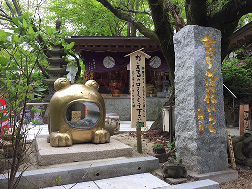 ✴️秘仏が安置される如意輪寺本堂前でしゃぼん玉を吹き出すカエル像