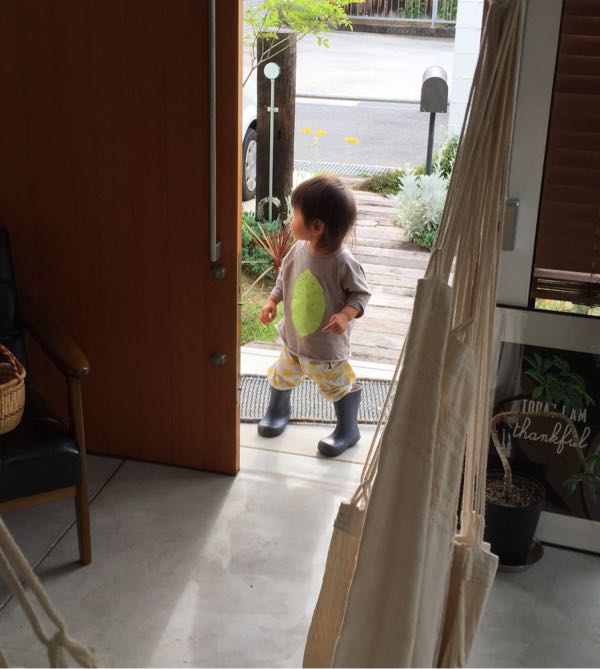 届いた日に試着して、嬉しくて庭に飛び出す長女。笑