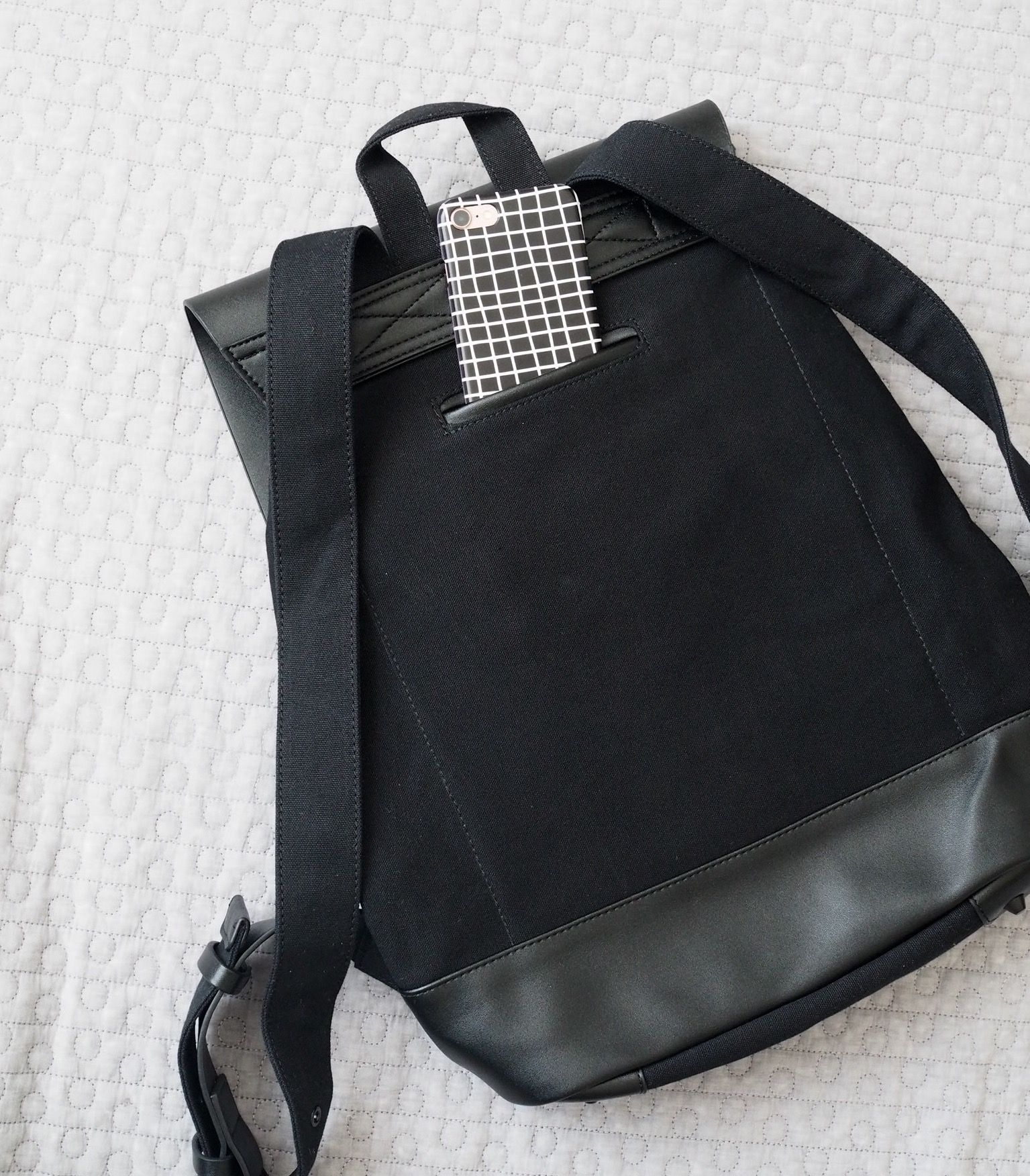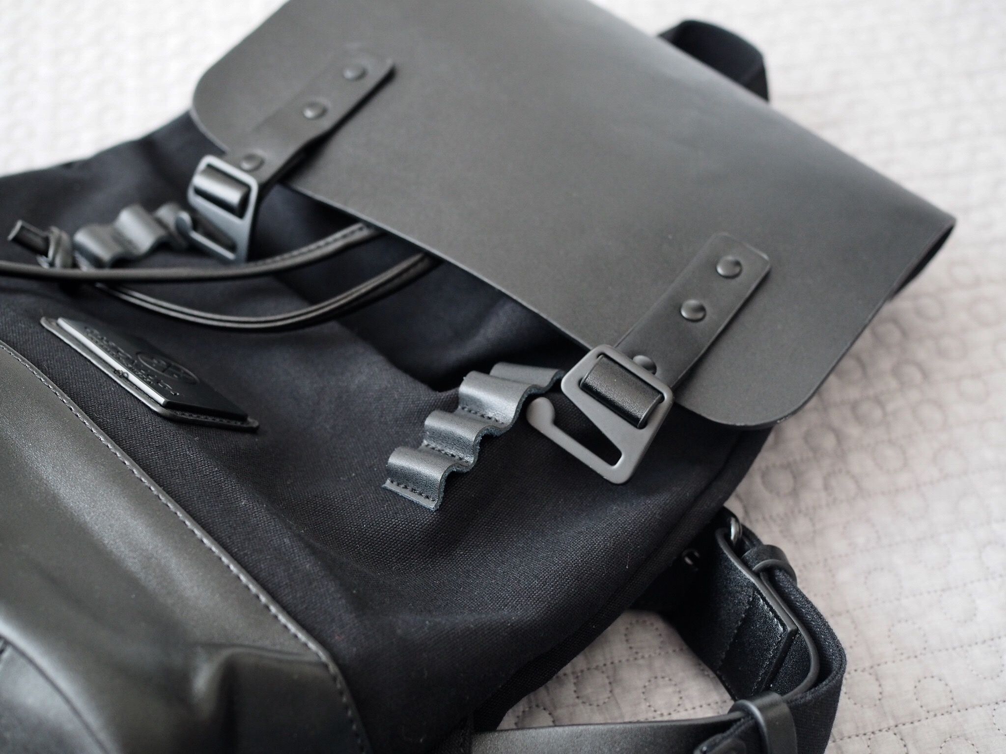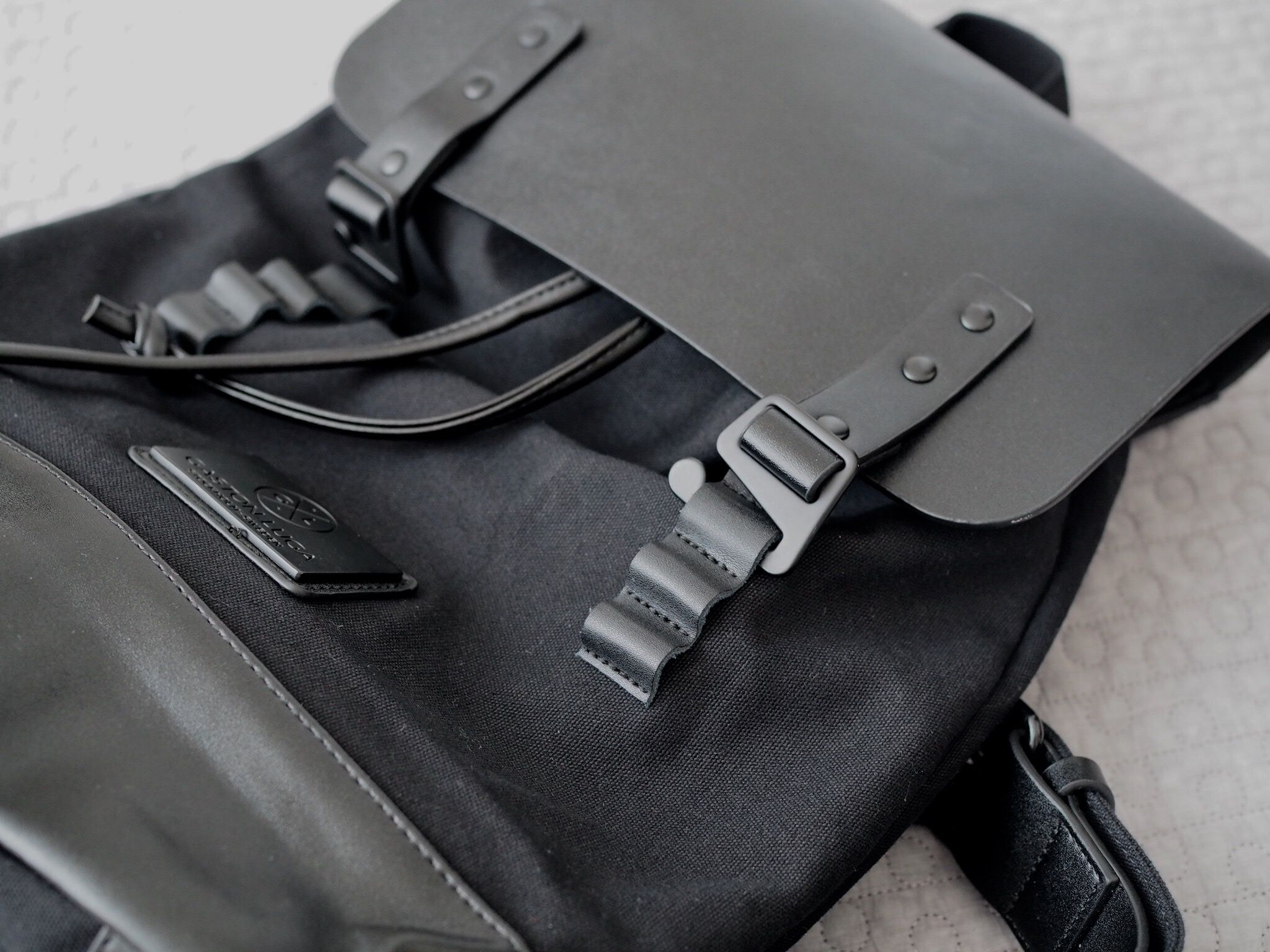 オールブラックでも、キャンバス地とレザーの異素材の組み合わせが
