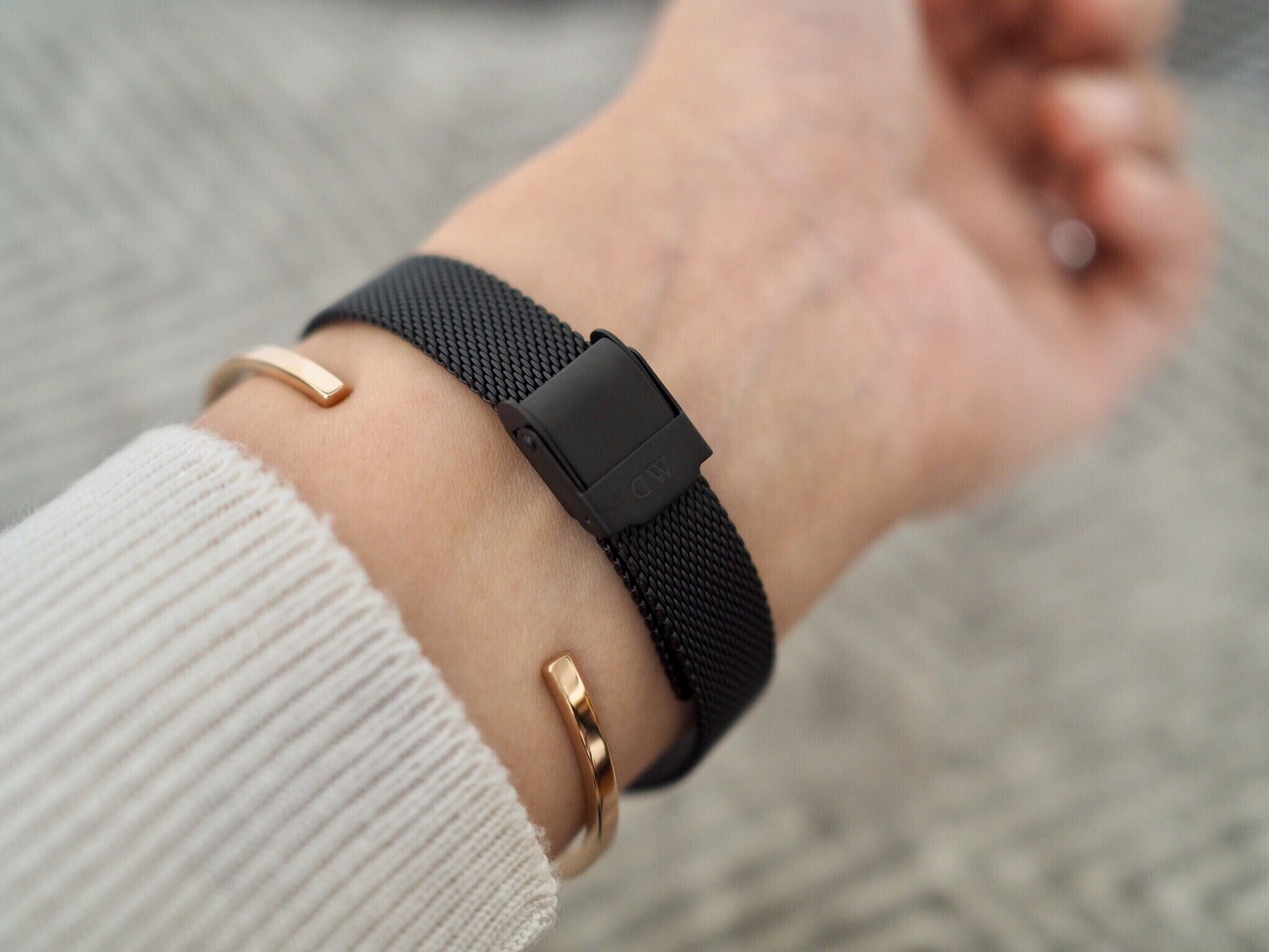冬は袖の中に隠れないよう、ニットなどの上からも付けられて