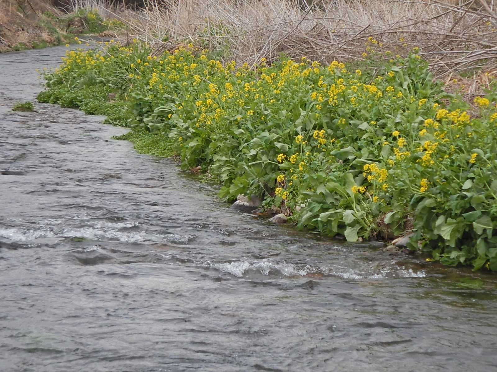 最高気温15℃、今日も大量のスギ花粉が飛んでいるようですが、川を見に行ってきました。渓流釣りでは普通は川の中流や上流ですが、今日、行ってみたのは里川です。湧水の川だからヤマメがいると聞いていました。川沿いを歩いているとフキノトウが出ていました。数個だけ摘んできました。土手のスイセンはまだ蕾、菜の花が咲いています。麦畑の緑が濃くなってきました。ここでは数羽のカモが泳いでいました。釣り人がいて、大きな魚を掛けていました。「40㎝くらいですか」と声をかけると50㎝近くありそうだと答えてくれました。マスだそうですがニジマス?、サクラマス?、シラサギがいるくらいですから魚もいるということです。渓流釣りが解禁になって6日、明日からもっと暖かくなるという予報なので、そろそろ釣りをしようかと考えています。