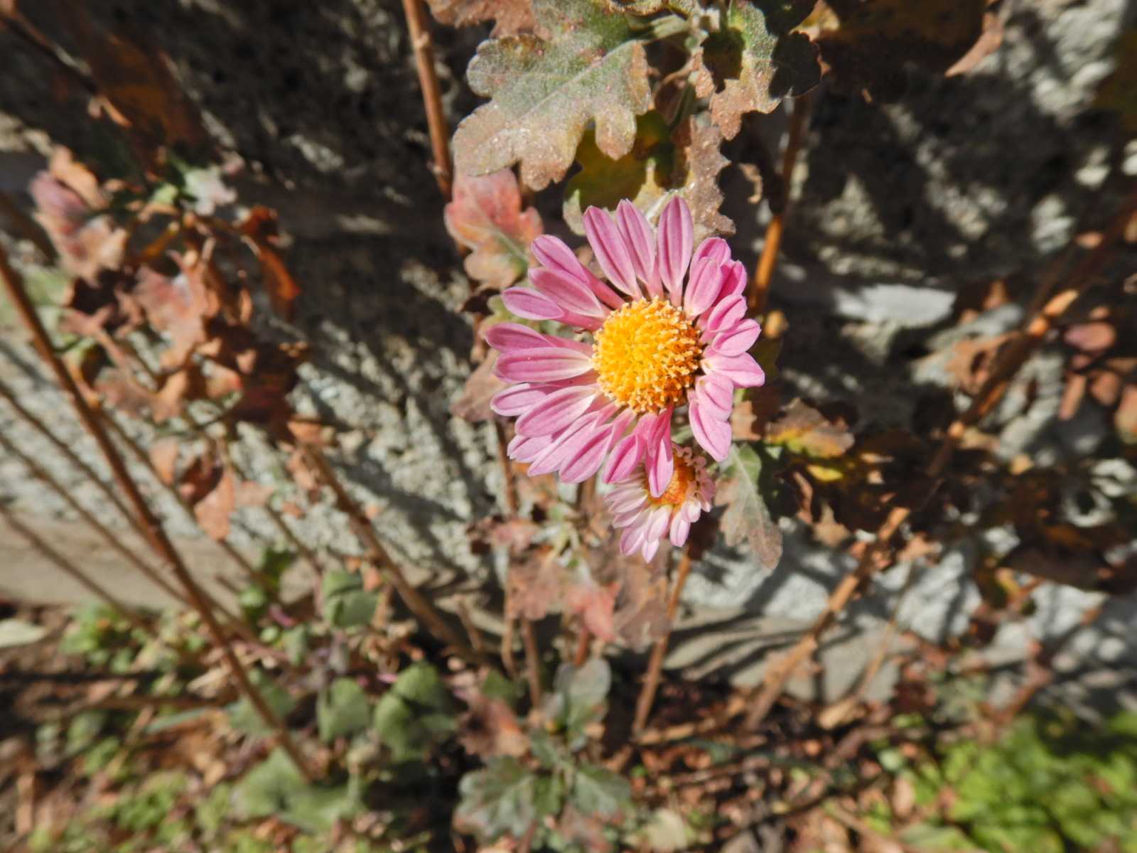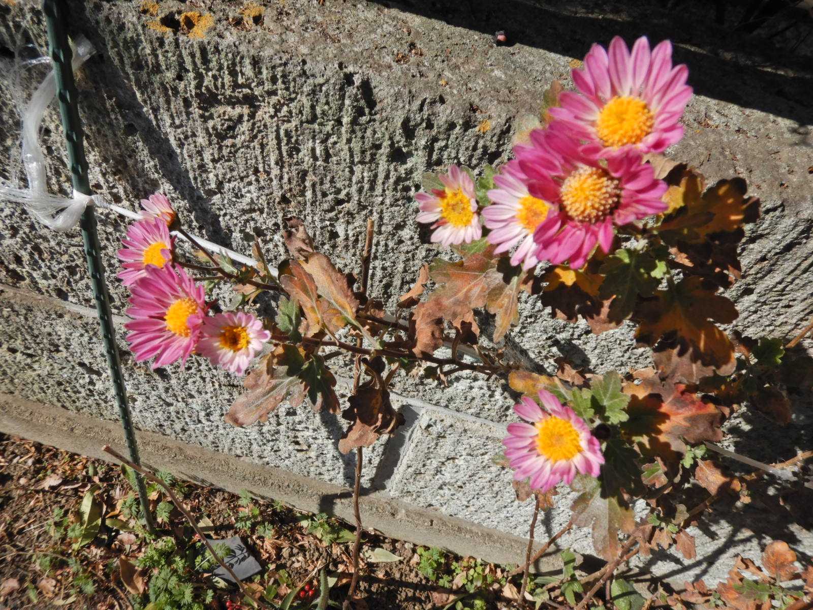 塀に寄りそうように季節外れの菊の花が咲いていました。