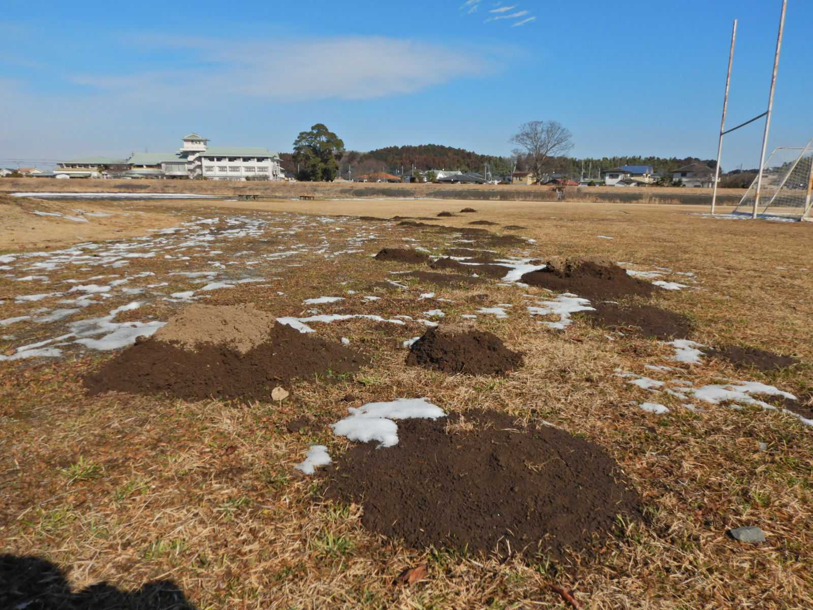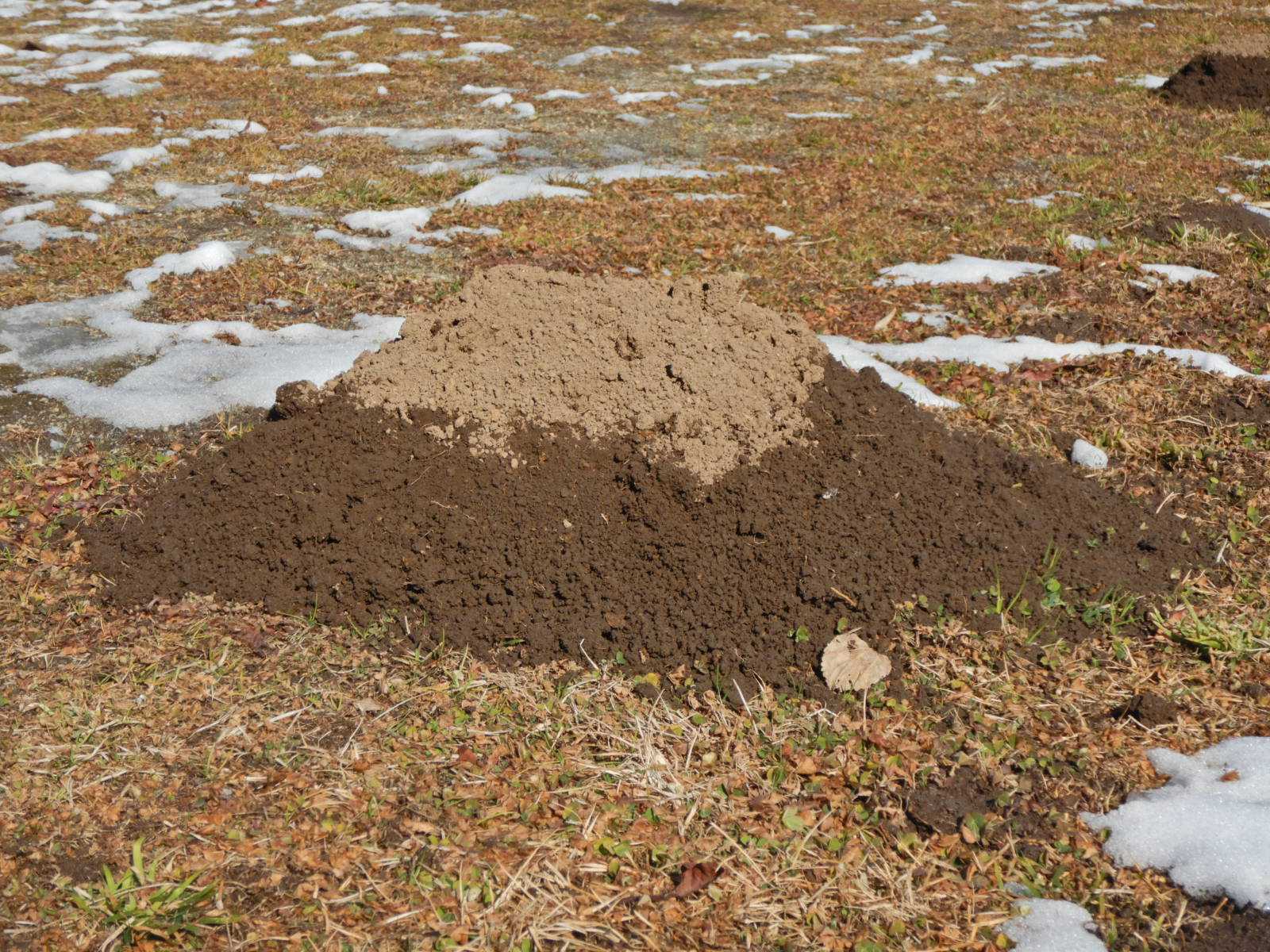 モグラ塚、地中は暖かいのでしょうか、モグラのやり放題と言うか掘り放題のようです。