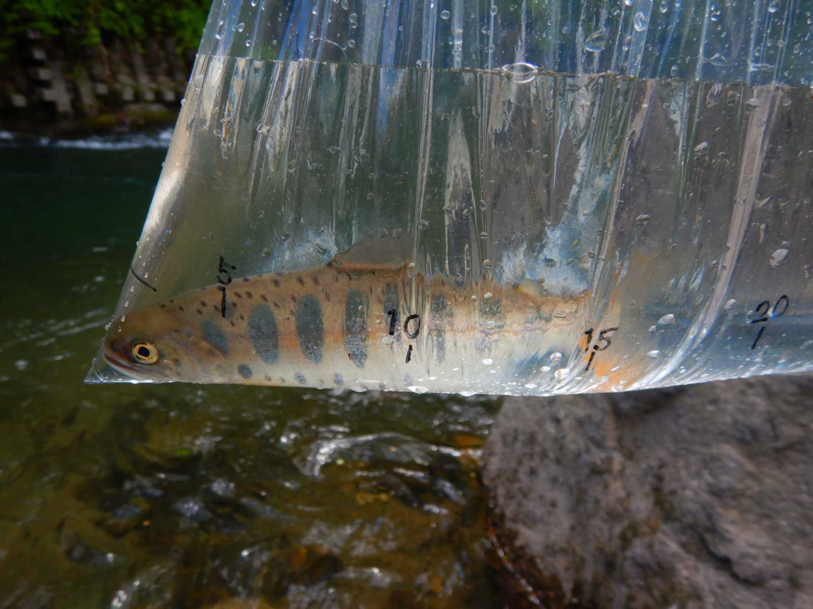 次はヤマメ、17㎝くらいでしょうか?、YouTubeで見たように幅30㎝のビニール袋に目盛をつけてみました。