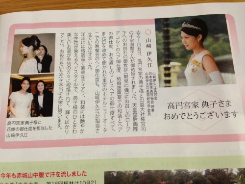 先月アップしたページです。★ ★ ★ ★ ★ ★ ★ ★ ★ ★ ★ 私共のサロンが所属する日本弱酸性美容協会の 年に三回発行される通信誌です。その中の一ページ 二代目の山崎伊久江先生名誉あるお仕事を成し遂げられましたね。★ ★ ★ ★ ★ ★ ★ ★ ★ ★ ★この事について今日お客様にお聞きしました。典子様もお母様の久子様も(多分ご一家で)ベル・ジュバンスのファンで山崎伊久江美容室のお客様だそうです。だから久子様 御髪が豊かなんですね。ところが出雲へ嫁がれた典子様はお近くにジュバンスの店がないそうです。ベル・ジュバンスの効果を分かっていらっしゃる方たちは止められるものではありません。だから私達のサロンも99.9パーセントがリピーターのお客様なのです。典子様はどうなさるのでしょう?毎月お里帰りされるのでしょうか~