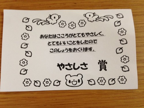 ナー君が園からもらって来ました。お友達を手伝ってあげたのだそうです。まさしく「褒めて伸ばす」の教育方針ですナー君 残留保育では赤ちゃん組も一緒の保育になるので小さな子の面倒をよく見るとの事で赤ちゃんのお母さん達に喜ばれているそうです。家では威張ってちょっと乱暴なナー君ですが外では違う面があるという事を知りちょっと嬉しいね