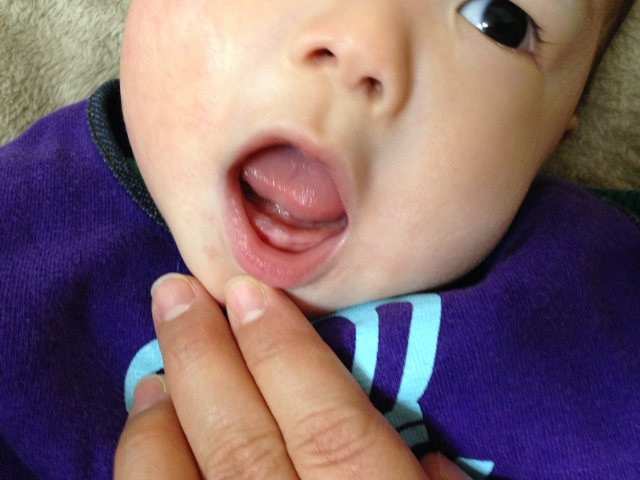 チビさんはもうすぐ7ヶ月。離乳食を初めて1ヶ月半。下の前歯が2本、綺麗な歯茎から生えだしていますこの画像を撮った時は、まだほんとに頭を出した程度だったのにみるみる歯らしくなってきています。自分でも気持ち悪いのか気になるのか、指を突っ込んで触っていたりちょっと受け口っぽいシャクレ顔になってたりそのままシャクレてくれるなよ