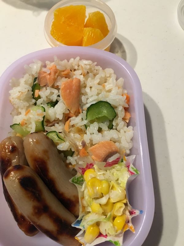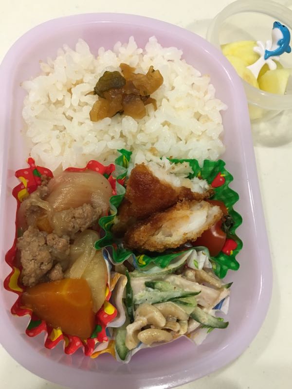 おはようございまっす⭐︎ 早速お弁当♬ 朝から衣付けて揚げましたよ😁 おにぎりは、ゆかり&天カスネギ醤油✨ 一方、朝ごはん⭐︎ 陸→昨日焼いたクリームパンとオレンジ🍊 夫→クリームパンと肉まん 玲→肉まん半分。 ↑ 全部食べるとお弁当を全部食べられないかも と思っての半分。 3歳にして、もう弁当の配慮(笑)
