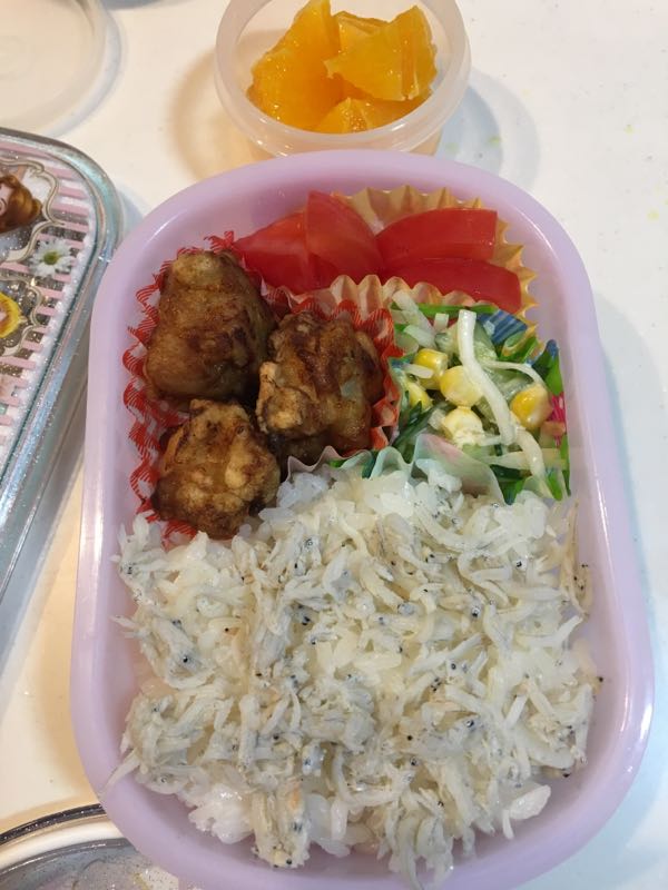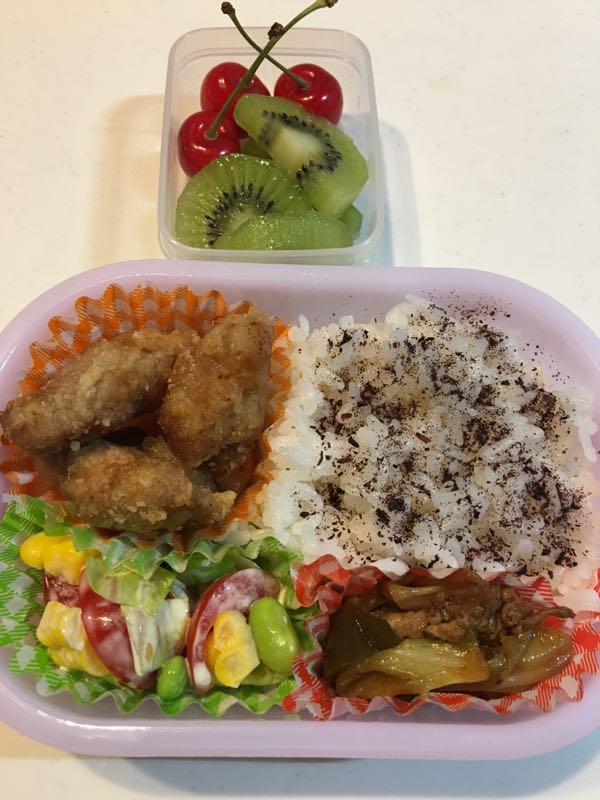 おはようございます〜☀️ いやいや暑い一週間の始まりです! そんな月曜日のお弁当♬ 唐揚げ! 私は鶏肉を揚げる=卵使わず。 なので、竜田揚げ?なのかな。 でも、今回は珍しく 本っ当〜に珍しく、卵入れて唐揚げに⭐︎ 卵や粉を加える前の下味付けは リンゴ・ニンニク・生姜を摩り下ろし、塩胡椒、 醤油、胡麻油。 しらすご飯に、 大根と胡瓜とコーン🌽のサラダ♬ 玲、数日前から何となく両目を痒がっていて アレルギーっぽいのか、 はたまた幼稚園で2人程出た結膜炎なのか でも赤くはないので…😢 とにかく昨夜はいつにも増して痒がり、 夜だったので眠いのも加わり、ぐりぐり掻いてしまって😭 今朝もまだいつも以上にしょぼしょぼと 小さくなっていて。 気になるので 陸が帰宅したら眼科へ行こうと思います😓