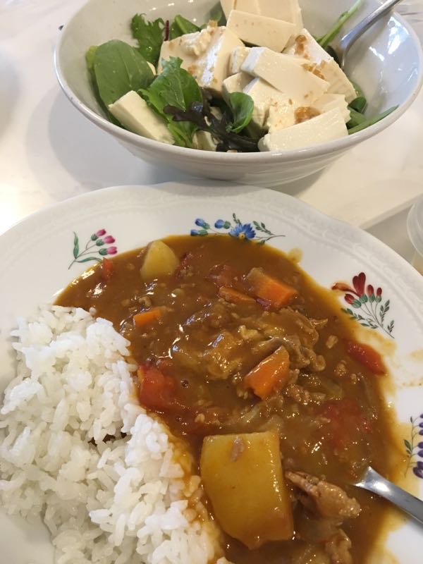 こんばんは🌜 寝た玲に目薬打ったぞ。夜中の3時半に打った昨日と比べて、 全然起きなかった‼️ やはりレム睡眠、ノンレム睡眠の関係だな! 夜ご飯♬ 挽肉と豚肉、トマトとキャベツが入ったカレー⭐︎ サラダはリーフ、ベビーリーフ、豆腐。 カステラと生クリームと桃のパフェ。 こちらは残念ながら、甘過ぎた😭😭 またリベンジかな。 夫用には、茹で卵をプラス♬ 明日はお話やさん(幼稚園にて、園児に向けて紙芝居を読みます)だよ〜 と、陸に話すと 明日、学校休む。って(笑) 可愛いな。ありがとう✨ でも、休まないよ(笑)