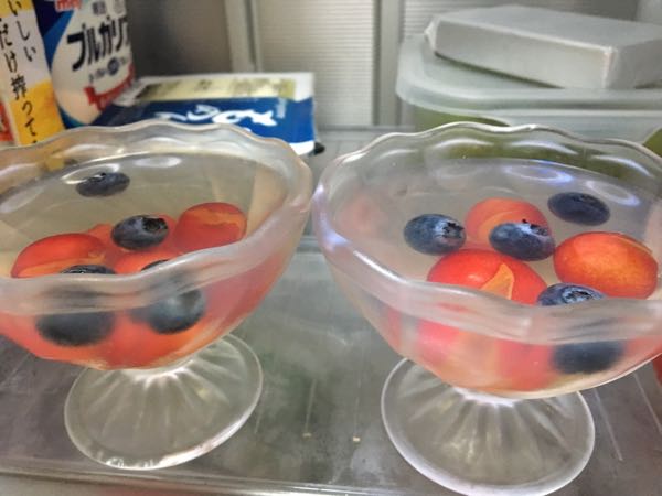 暑いですね〜 風強いですね〜 今日は涼しげなゼリーを♬ 後ろの木綿豆腐が気になりますが さくらんぼ🍒とブルーベリー。 甘い物苦手なので、一般レシピより 半分ほどの砂糖の量。 でも私にはやや甘いんですが そこに酸っぱめのブルーベリーが美味しい💖 さくらんぼの種を取ったので 割れちゃってるけど😅 夜ご飯の一品。アボカドとミニトマトの ワサビ醤油和え。