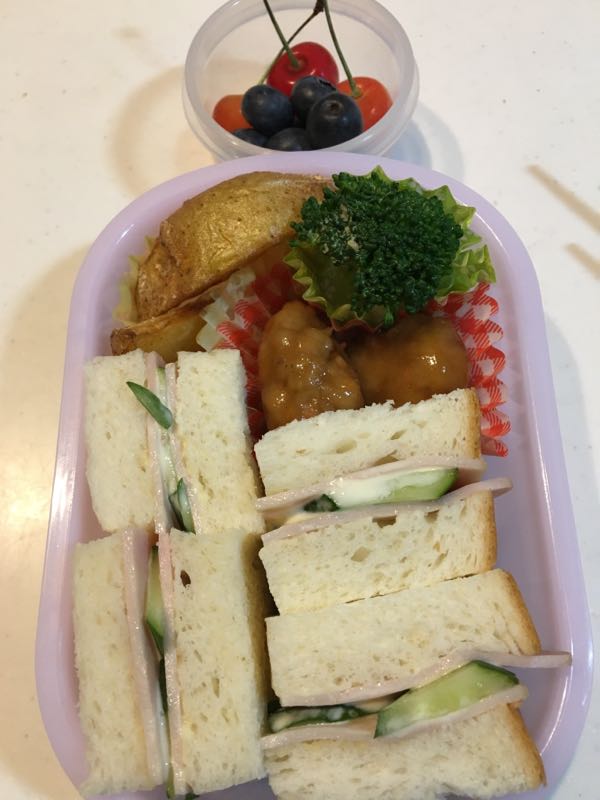 おはようございます‼️ まだこの風は続くのね。。。 本日のお弁当、初の サンドウィ〜ッチ✨(ガタガタ💦) 茶色の物体は、焼く前まで作って置いて 冷凍ストックしたミニハンバーグ。それを もっと小さくして丸め、片栗粉まぶして揚げ焼きし 出汁、醤油、砂糖を火にかけて 肉団子入れて少し染み込ませ、水で溶いた片栗粉で トロトロに⭐︎ 朝、もう一度温めるだけ。 ポテトは揚げて塩振ります。 なんせ玲さん、ご飯派ですし、あまり好きでもない イメージだったんですけども。 あ、サンドイッチの話ね。 数日前、 『玲は、サンドイッチのお弁当、好きじゃないよね?』 と聞いたところ、ハムサンドなら良い。との回答。 で、昨日も一応聞いたんですわ。やっぱやだ。 と言うかな、と思って。 でも、意外や意外。サンドイッチが良い。 と言うわけで実現したサンドイッチ弁当です💖 でも、作り終わって考えてみたら、 玲の好み、よく分かってないもんで 陸 基準で(→チーズ挟まない、レタス要らない) 作っちゃったなぁ。 もしサンドイッチもオッケーになったら、もう少し 色々作ってみたいなぁ♬ ん?梅雨明け? 水不足、大丈夫なのかな…😵💧