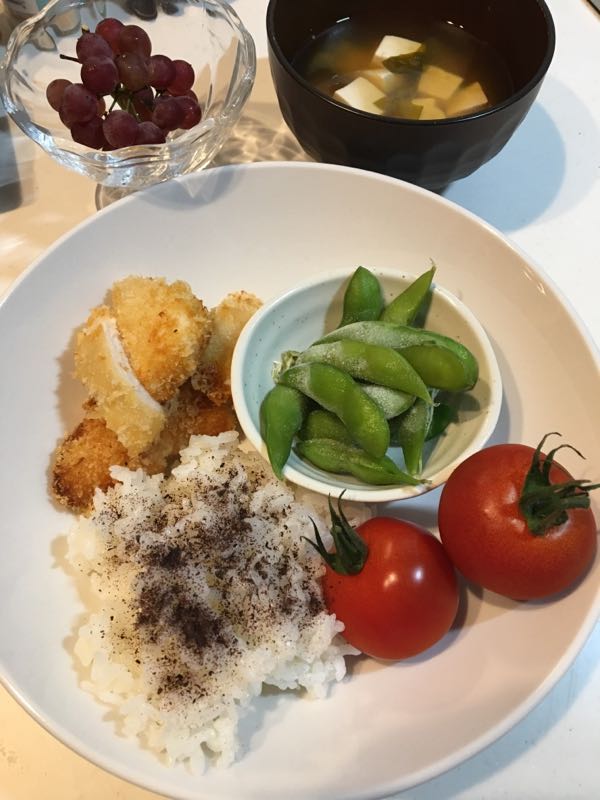 なんか、蒸し暑い… こんばんは。 今日は2時半から、幼稚園の木の害虫駆除で 薬を撒くので、すぐ横の公園では遊ばない方が良い。 との事で、せっかくのお天気だったのだけど 2時半前にはザザザ〜ッと撤収💦 公園は小学生が来るまでガランとしてました。 で、幼稚園の上に住む我が家も、何だか嫌なので 大量の洗濯物を引き上げ〜💦💦 まぁ、そうこうしてるうちに4時になり もう大丈夫だろうと下に行くと 通りかかった幼稚園で先生が、 『今からなんですぅ〜』 って… え? なぜ?? で、公園へ行くと、先生が2人公園に来て 害虫駆除始めますので、と声かけ。 大体3〜40分で終わるという事と 業者さんが遅れたらしい事。 じゃもっと日中、遊べたじゃん😅 で、陸にも声をかけ、ぞろぞろとそれぞれ移動〜 で、5時過ぎに帰宅し、ササミのチーズカツ揚げて 今夜の夕食♬ 陸の。 夫の。 デラウェアは、玲のお腹に収まりました😂 ミディトマト、でか! 珍しく肉肉しいな🍖