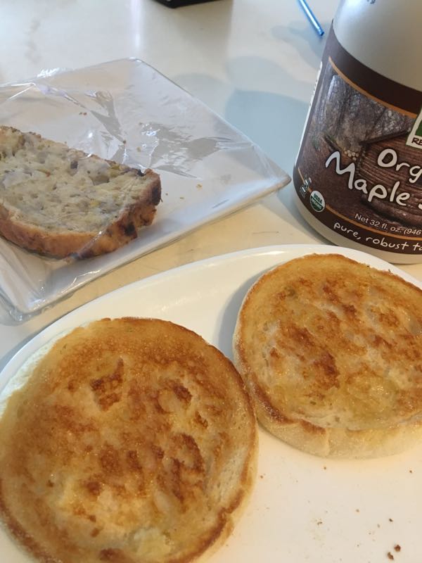 ギリギリおはよう?!こんにちは? そんな時間でございます。 本日、玲午前保育。 陸4時間授業。 はやっ 朝ごはんは ゆっくりなのに、あり得ない貧相っぷりを 見せつけましたが またこの久々のイングリッシュマフィンが 美味すぎるぅ〜😍 バターたっぷり染み込んだ所に メープルたらり✨ もう最高✨ 横にいらっしゃるのは昨日焼いたバナナ🍌パウンド。 他にエクレア食べて、登校&出社。 さ、生協片してお迎えだっ 今はヨーグルト入れたスコーン焼いてます💖