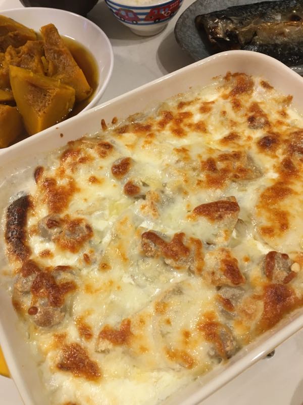 土曜日。それは私の疲労が蓄積する日。 疲れ果てた夫。 仕方ない。そう、仕方ない。 さ、夜ご飯⭐︎ グラタンは、玉ねぎ・ウインナー・じゃが芋。 牛乳、コンソメ、塩胡椒で煮て、最後に生クリームを少し加えました♬ 他は 小松菜と油揚げのレンチン煮浸し。 西のかぼちゃ煮。 味の濃いミディトマト🍅 大根の味噌汁 天日干し塩鯖💕おいぴー お腹いっぱい 午後は陸のデュエマカード買ったり。 その間遊ぶ。 アイス食べてたこ焼き食べて(笑) 明日から週間天気予報見たら、30度以上ばかり😳 梅雨の晴れ間かな??