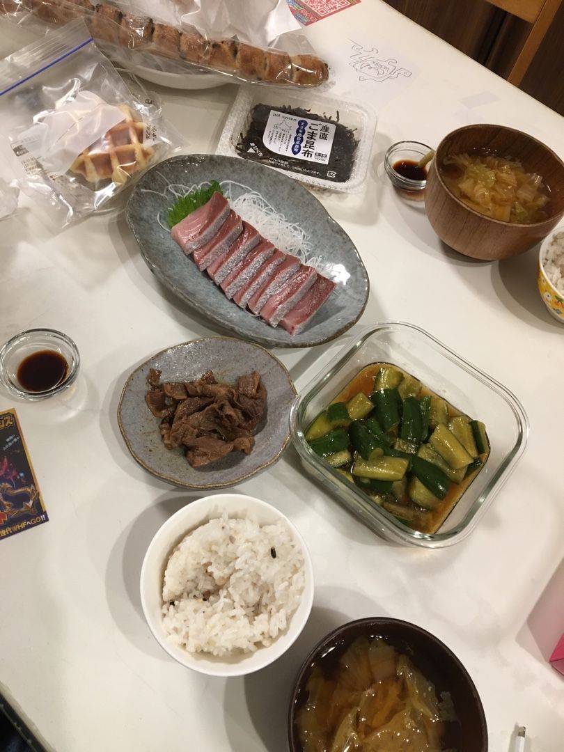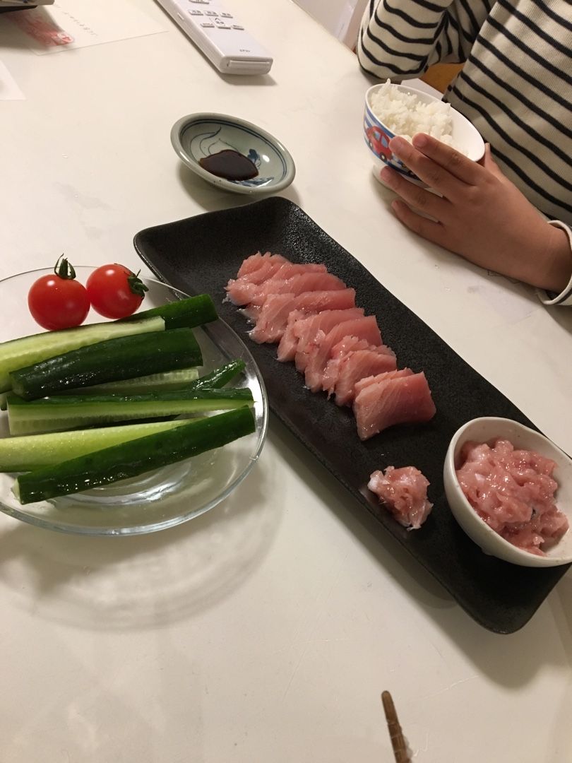 あー、お疲れ様です✨ 明日で3連勤終わり。 その後はまさかの5連休!! その理由は じーじばーばが旅行行くから〜(笑) でも5日も休むなんて仕事始めてから初! ま、保護者会あったり親睦会あったり体操参観あったり😅 何だかんだでやる事あるんだけど、ね。 それにしてもめちゃくちゃ寒かったぁぁぁあ😭 風が吹くなら南風だけにしておくれ。 我が家の最後のマグロ。 正月用に柵で買い溜めするのだけど いよいよ本日で終わりました😂 また来年〜 良い香りの中トロでした。 あとはイカフライ。 パルミジャーノにブルー。(私大嫌い) 野菜は?! ミニトマトとスティック胡瓜のみ… 豚汁作る時間なかったんだもーん💦 今、仕込んでます😅 明日は私以外の3人、夫の実家へ🚙 行ってらっしゃ〜〜い♬