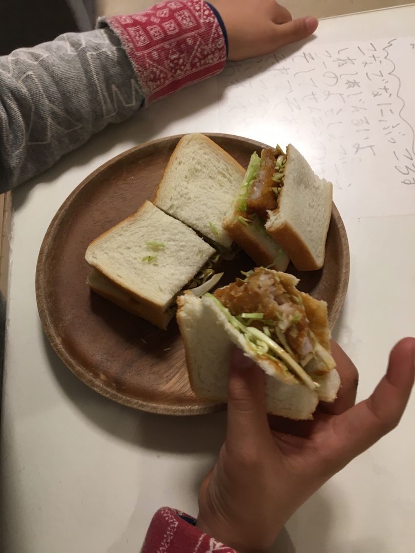 お迎え前に寝室のカーテンもゴシゴシゴシゴシ!! うっかりお迎えの時間過ぎちゃったけど💦 綺麗になって嬉しいな😆💖 その後少し遊んで 陸が先に家に帰り、私、玲の順で帰宅♬ 午後は比較的ゆっくり✨ 陸の夕飯に作ったカツサンド。 私、玲も適当に食べたんだけど 突然ノーディナーだった予定の夫が帰宅。 明日、明後日とノーディナーの予定なので 明日の弁当用に作った煮物も急遽プラスして😅 カツサンド余って良かった💦
