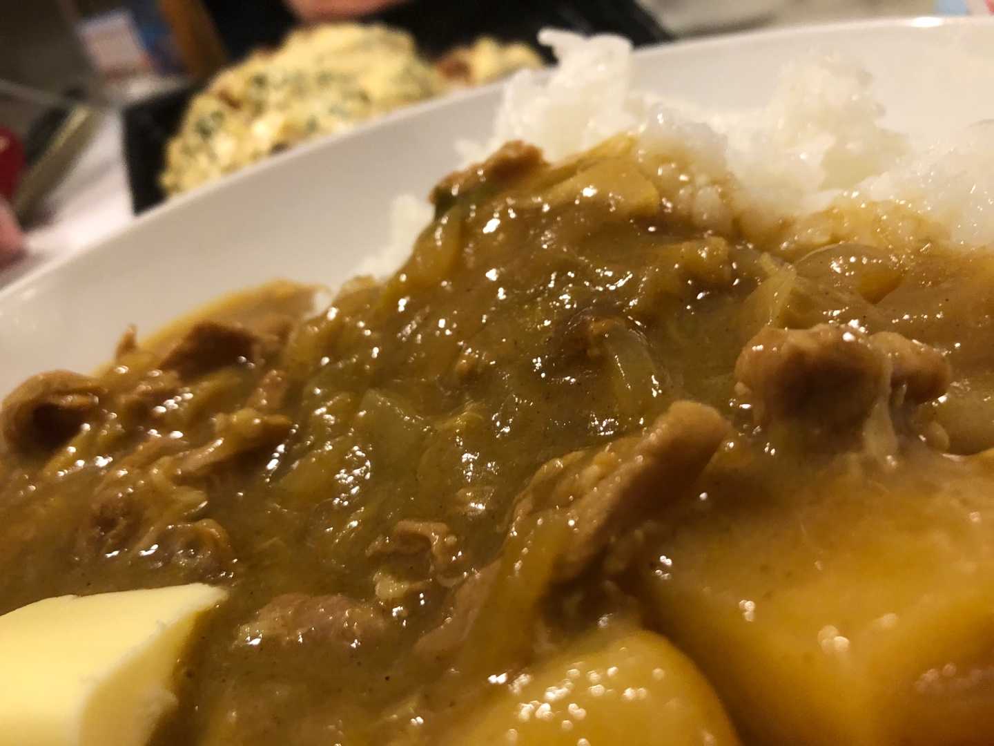 お疲れ様でございます! また、セミ=5番が定着しつつあるそろそろやめてくれよ、な日々です、はい。 もぉぉう、寒い!!!!ムキーッッ💢 明日まで我慢(´;Д;`) 今日は昨日仕込んでおいたカレー♬ 白菜たっぷり入れてみたら めっちゃ美味しい😍✨✨お勧めです! 陸は必ず、バターオン!本当、バター好き🧈 この、どう見てもカロリーやばそうなやつ 仕事中から買って帰ろうと思ってたんだ〜 他、サラダやらっきょう、福神漬け🌟 明日の分もたっぷり残ってる!添加物入ってないからもたれません😆 さて アイロンかけて風呂入ろ! 今週は明日がラスト♪