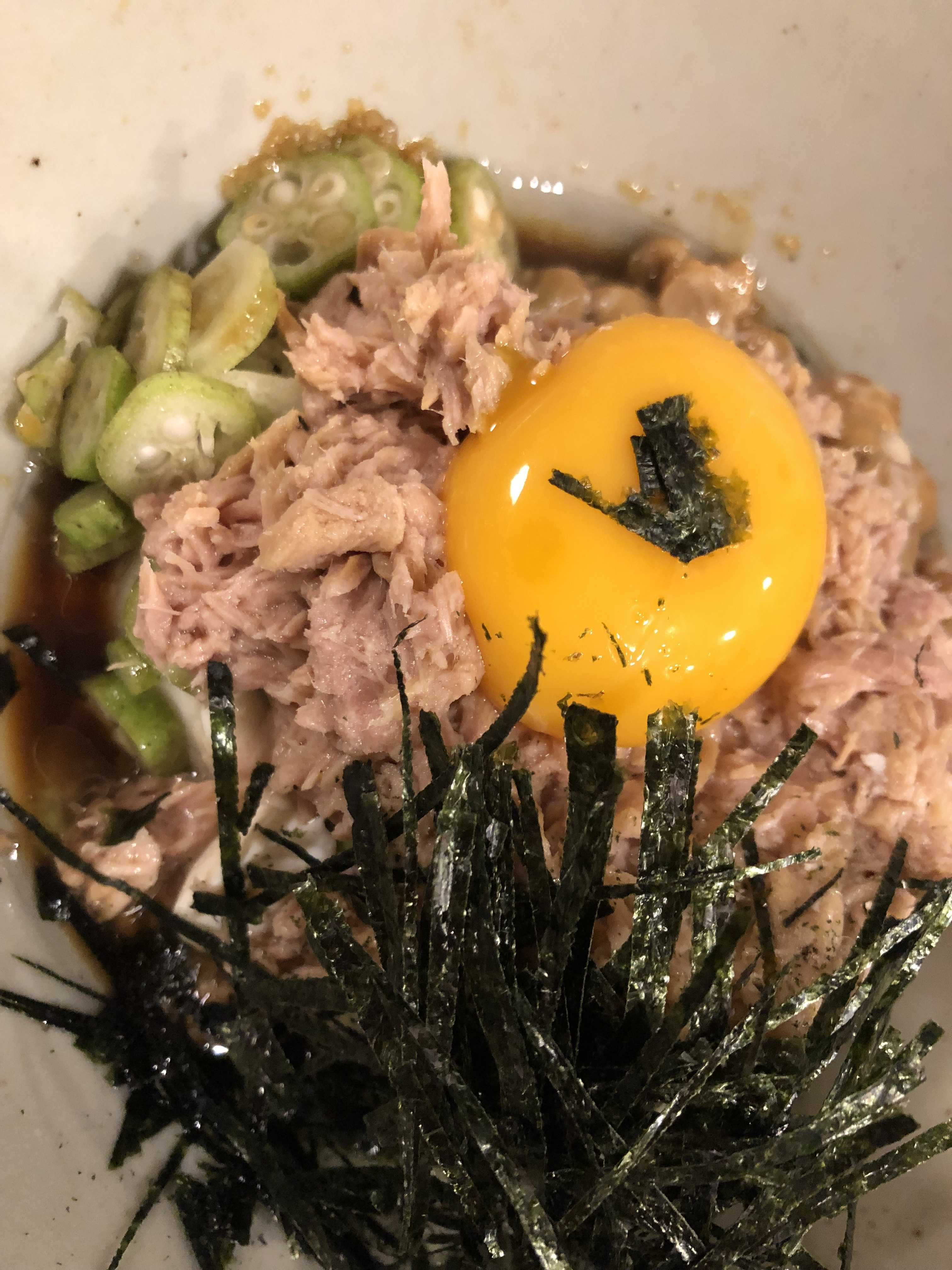 日曜だからかな?買う量は多いけど人が少ないかな、という印象。大忙しの3倍では全くなかったデス。買い物して帰宅後、豆腐と納豆を買い物袋から出したら、夫がこれとこれとこれと、混ぜたら美味しいよみたいな話の流れに乗っかって、作って‼️と言ったら作ってくれた🤩イェーイ✨納豆、絹豆腐、オクラ(らでぃっしゅから来た生食用)海苔、卵黄、ツナネギが無いのを悔やんでたw私的にはキムチかな!割とツナ強めだけど、美味しい🤤高タンパクな感じが良いわぁ✨他の人は豚カツにカレー。カニクリームコロッケもあり。陸はカレーにバターとチーズ乗せて、豚カツと食べてた🍛ヘビー!今朝はクリームデニッシュ食べて行ったんだけど職場着く頃には腹減りで軽く震えててw煎餅かじって塩分チャージ噛んで誤魔化してた。朝ごはん、そろそろ菓子パン卒業かなぁ。。。タンパク質など、もちっと意識した物食べないとダメな年齢になってきたんじゃないのー???