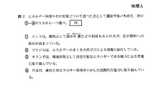 続いてまた、センター試験「地理A」 さすがに世の中の動きには敏感な教科ではある。(教科書の暗記より、日頃のニュースに親しんでなくちゃ)「地球環境」のテーマは避けて通れない。(避けて通ろうとする奴に大学生になってほしくない)当然、入試にも反映されるけれど、 もちろん、ブラジルが天然ガスに依存してるわけはないから、「正解」はわかるのだけれど、 じゃあ、日本って、省エネルギーに国際貢献してるのか? 「取り組んでいる」というのは、便利な言葉やなあ…、というのが実感できてしまう。 (選挙の公約で「…に取り組みます」というのも要注意だが) ついでに ビンの回収で地球的課題として必要なのは、「リユース」(再使用)だと思うのだけれど、あえて「リサイクル」(再資源)を強調するか…。 たしかに、使い捨て(ワンウェイ)のビンはリサイクルボックスで集められてはいるけれど、実際には、ドイツの飲料容器はガラスびんとPETボトルの合計で、「ワンウェイ」より「リターナブル」容器のほうが主流。(缶ビールは、ドイツでは邪道らしい。) 間違いではないけれど、正しいといえるのか?