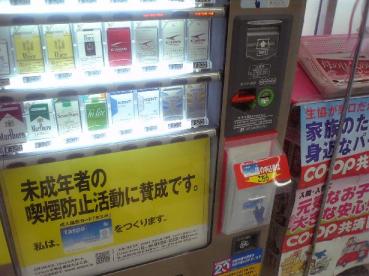5月から「タスポ」が運用されはじめた。 嫌煙派にとっては、まあ、遠い世界のできごと。 せいぜい、「誰か、それで儲かった人がいるんだろうなあ」という程度。 しかし、そこまでして自販機でタバコ売らにゃならんの? ときどき、 「店内」の自販機にも「タスポ」 (某生協店舗にて) 残留農薬や、賞味期限偽装の食品より、「タバコ」のほうが健康に悪いよ。 でも、わざわざ新しいカード作るぐらいなら、例の「住基カード」で認識させたらええんとちがう? と思ってしまう。(酒の自販機で、夜間に免許証を提示させる奴がある) 一方で、「スマートICOCA」などの「個人情報入りICカード」や「おさいふケータイ」で、現金なしでタバコを買えるような改造、たぶん、進んでいると思う。