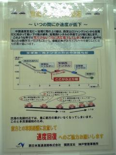中国自動車道上り、宝塚西トンネル付近は、渋滞の名所になっている なんでも、トンネル入り口で「下り坂」から、ゆるい「上り坂」にかわるため、いつのまにか速度が落ちた車の後続車が、車間距離の詰まったのにあわててブレーキを踏むんだとか。 ということは、「速度が一定」ならば、渋滞の原因が一つ減る。 要は、ドライバーが上り坂になってるのを意識して、速度を安定させればいいわけだ。 そこで渋滞解消提案。トンネル内は、景色が見えないので、基準となる水平垂直がわからないじゃあ、トンネルの壁の柄を斜めに色分けしたらどうだろう。 ⇒/⇒/⇒/⇒/⇒/⇒/⇒/⇒ これなら、「上り坂」やろ・・・。 シマシマ模様は目に悪いがいま、コンクリートの継ぎ目が「道路に垂直」になってるのを「斜め」にするだけでも、ちょっとは違うと思う。 もっとも、第二(新)名神を作りたがってる人達にとっては、渋滞が減って、口実が消えたら困るんだらうが…。 (だから、誰もそういう「裏技」を実験しようとしない? 「なんとか社会実験」より安くあがるはずだが)