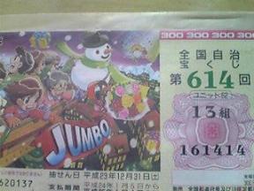 去年は買いそびれた(損せずにすんだ)「年末ジャンボ」宝くじ。今年は忘れず購入。 例によって、2億円が当たったら、ユニセフに寄付するぞ!宣言。(数学的に、買う枚数が増えるほど期待値に近づき、損をするに間違いありません。あくまで「話題提供」のためにやってますから、くれぐれも「真似」をされないように。賛同される方は、「お気持ち」だけ参加してこの画面をコピーしてください。 300円は募金のほうにお願いします。)過去、1000円の購入で1400円の当選だから(去年は買い損なって、「近畿宝くじ」100円で1100円当たった)、確率的には「いい線」いってる。(普通は、700円損して当然)さて…。語呂合わせは、「イチローいよいよ」 ついに、大阪をぶっ潰すのか・・? どっかの一郎