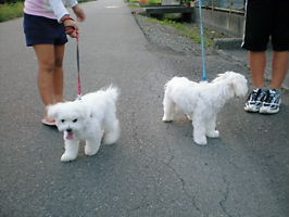 いや~~!! せっかく、お散歩に行ったからブログ用に、写真撮っとこう~。 と思い何枚か撮ったものの、まったくうまく撮れない・・・。 「チーズ。マール。こっちだよ。」 あぁ~マール。なんでそっち向いちゃうの? もう一枚。 あぁぁー!! 今度は二匹とも、そっぽむきました。 また別の日。 まったく~!! なんで、こっちを見ないの? 無理やり向かせた。 やっと、顔が見えたよ~。 みなさんのブログを見ると、すっごくいい表情のお散歩写真が、 たくさん撮ってあるのに・・・ みんな、どうしたらそんなに、上手に撮れるんですか? 2人とも、ちゃんとお顔を見せてね。 この写真も、カメラ目線ではないでしょ。 でも、二匹がおとなしく座ってる所は、中々撮れない。 もちろん、エサで釣っています。 やっぱり、エサか・・・。