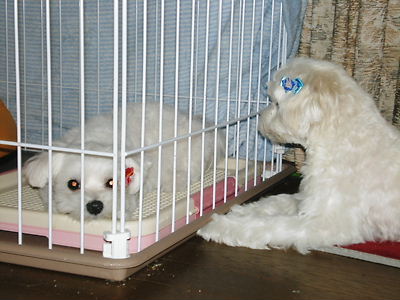 チーズがヒート中の為 マールをゲージに居れていたが、クンクン・クンクンうるさい、うるさい。 試しに、チーズをゲージに居れたら ずっとこの状態。 ゲージから離れません。 たとえ眠たくても、寝てもチーズの傍を離れようとしない。 チーズより、マールのストレスが溜まりまくっていそうな為 マールのみ、散歩に連れて行ったが・・・ 玄関を出ても、道路に出ても、後ろばかり振り返り散歩に行くより チーズの事が気になっている様。 半ば無理やり引っ張って、家から100M位行ったところで、 ようやく、散歩する気になったもよう。 「風が気持ちい~い。」 「お散歩楽し~い。」 溜まったストレスを発散するかのように、 初めての 外ション。 今までお散歩に行っても、絶対おしっこしなかったんですが、 チーズにずっと付いてて、我慢してたからかな。 「あっ、僕の恥ずかしいとこ見せちゃダメじゃん。」