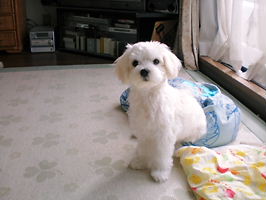 またまた、やらかしてくれました。 本日も、どうやら犯人は・・・ 分かりますか? ちゃんと、見えてるかな? 青いマルチーズが・・・ 帰ってきたら オムツが散乱&青いスタンプが落ちていました。 「おかあたん、あたちじゃないのよ。」 「あの、口元見れば分かるでしょ。」 「はい、分かります。犯人はマールです。」 バレバレです。 「な・なにが・・・ 僕はなにもしてないよー。」 言い逃れはできません。 その顔が、何よりの証拠。 まったく・・・。 せっかく、マールの新しいベット買ってきたのに。 どう?気に入ってくれた? 「まあまあかな。」 「マールばっかりずるい・・・」 「えーっだって、チーズのベットはあるじゃん。」 「だって・・・あたちの・・・。」 チーズのベットに目をやると・・・ えっ・・・王子・・・そこは・・・ 王子。ベットにはまって、テレビを見ていました。 この後ちゃんと、チーズにベット返しましたよ。