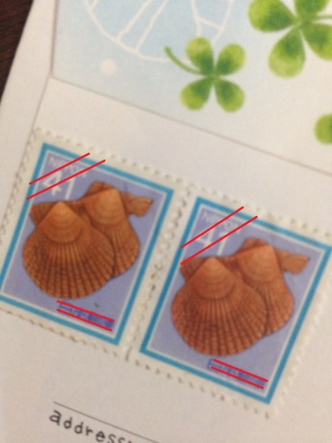 勤めていたときの同期から、ホタテとカニを送っていただいた。お礼状を書き終わり、「そういえば消費税アップで切手料金も変わったな~」と80円+2円切手で出そうかと思っていたらちょうどいい切手発見。ホタテの41円。
