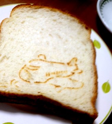 食パンって関西方言かな。書いてみると変な感じだ。 大昔だけど、戦争が終わって食生活も大変だった頃、「配給」というのがあって食パンにありつけていた。配給は近所のお宅が係りだったのか、その家の前で並んで順番を待った。僕は6~7歳、だから母は30歳ぐらいだっただろう。母は僕を連れていた。弟が居た記憶が無いのはどうしていたのだろうか。パンが配られると、家まで戻る5分ぐらいの距離で、僕は歩きながら食パンを食べて、帰宅したら食べてしまっていた。全部じゃないとは思うけれど、もしかしたら全部だったのかも知れない。食べてしまっていいのかなあ、と子供心に思ったことだけは事実だ。 食パンを真ん中の柔らかいところから食べ始めるあの感触は香りと食感とともに忘れることが出来ない。ほろにがい心の痛みとともに。 今うちの三歳児は保育園でも先生に可愛がられているけれど慎重なタイプと言われてもいる。熱い食べ物に警戒心が強い。だからトーストも熱いと思っていて警戒している。 それで、過日好きな飛行機が浮かぶトースターを娘宅に上げたら、作戦成功三歳児の一気にマイブームになった! そうでなくてもマルちゃんと呼ばれてるのに、よかったようでコマってもいる。 このトースターは実は、このところの整理作業で発掘したものだ。全日空のマイレージで交換したものを死蔵していたのだった。 仕掛けは、こういのが入ってるのだ。