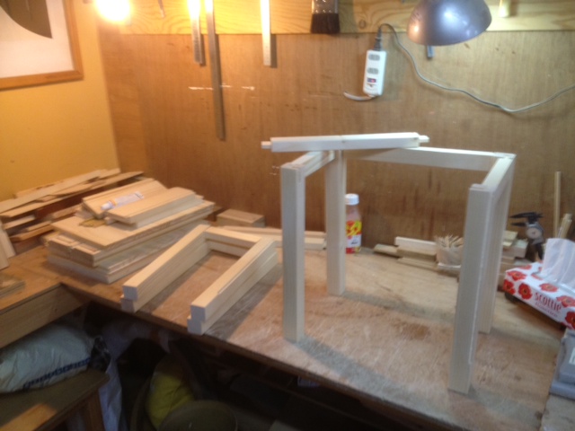 やっと脚部分を組み立てる段階に入った。 もともと不得意分野だからだけど、途方もなくなんでも時間がかかるのだ。木工教室は3時間が単位なんだけど、3時間かかっても採寸だけで終わった日もあるし、木を組み合わせる凸凹を加工するだけでも2回にまたがったりする。昨日も実は部材の表面をペーパーで綺麗にする作業だけで終わりそうだったけれど、kaori先生の口ぶりからは脚の組み立てまでは行かなきゃという感触だったので終了30分前にやっとペーパー終わって、4隅の接着だけはして帰ろうと思った。でも、実は2台同時進行しているので、やっと一台分の接着をしたところでもう5分となり、ゆがまないように接着を固定化するクランプの取り付けには結局はKaori先生が乗り出してくれた。 クランプで締め付けると接着剤がはみ出してくるので、それを取るのが僕の役目になった。接着剤も筆を水で濡らせて拭いて、すぐティッシュで綺麗にするというやり方を些細なことのようだけどここに来てから覚えたのだった。 作っているのは、ローテーブルスタイルのソーイングボックスで、去年秋一緒に展示ブースをしたアクセサリーのryokoさんのそのとき来られた母上から頼まれたもので、年末には出来ると思ってたのが、まだまだ出来そうにない。 忘れずにやっていますからねえ~、と伝えたいのだけれど、そんなにも時間かけているのだからどんなものができるのだろうと余計に期待をかけられてもヤバいし、ちょっと気持ちは落ち着かないけれど、出来上がるまでは出来ないのだし、Kaori先生の元でやる限りはゴールインは出来るのだ。 kaori先生の木工教室は、先生の人柄、技量ともに最高です。