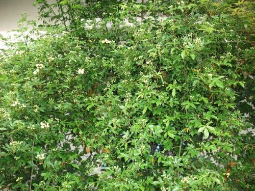 シンジロウ氏が審議拒否の拒否をしていて、拒否されて喜んでるのは大臣のほうだろうとうまいこと言っている。なかなか常識のある快男児だ。 会社なんかでも変な人事はいつも混じっている。およそ不向きな人物が大臣になっても不思議はないのだけど、どの政権でもあまりにも多い。人事権をもつ首相に人を見る目がないことと、もっとありそうなことは、指導力が欠けていていろんな権力者事情に翻弄されるからだ。官僚支配国家だから大臣は操り人形役みたいなものではあるけれど、それにしてもひどすぎる。 そんなの関係ないとでもいうように、モッコウバラは一日でさらに成長し、蔦もまたさらに自己主張を強めている。
